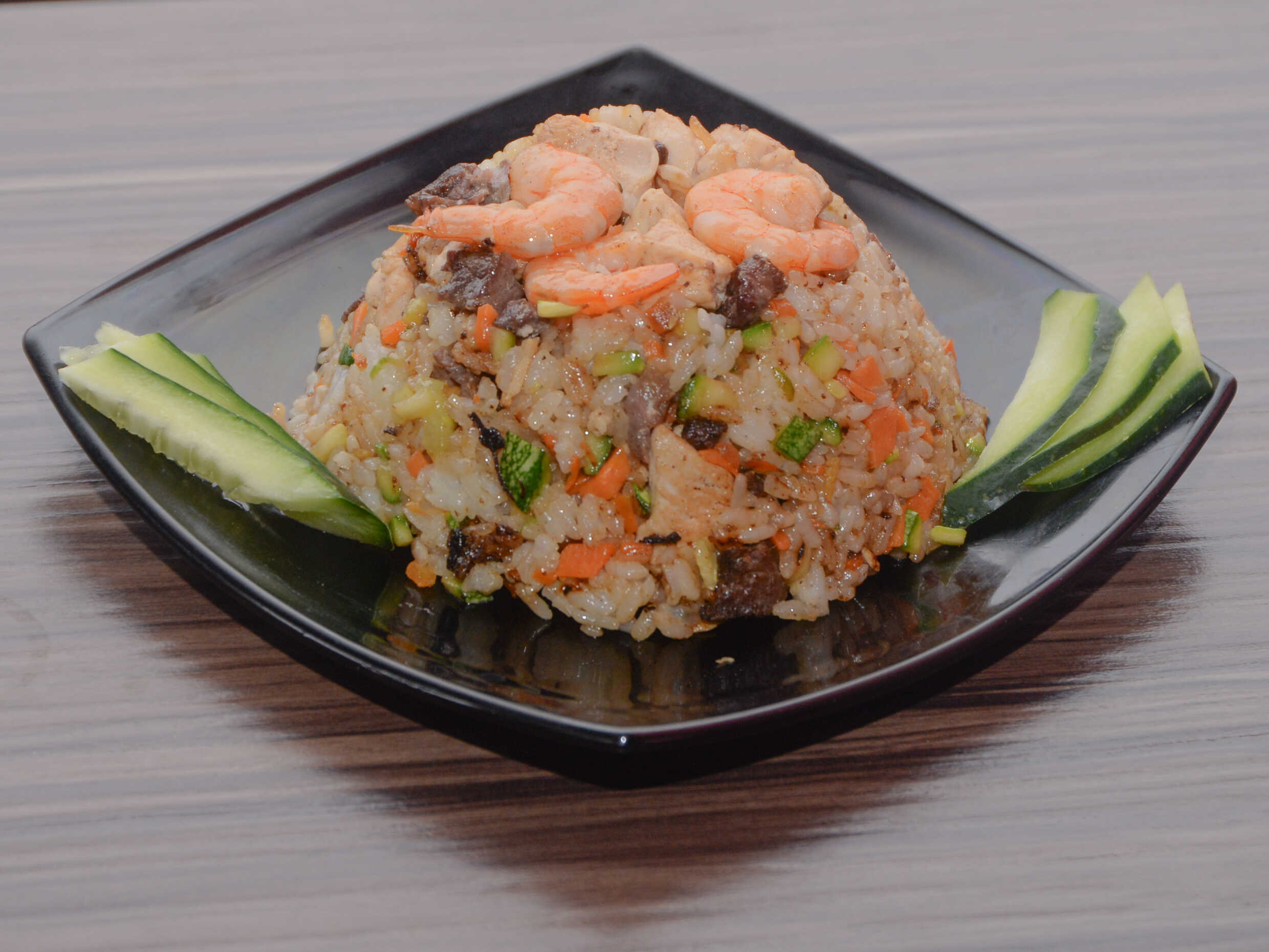 Camarón, cebolla,morrón, bañados en salsa teriyaki.