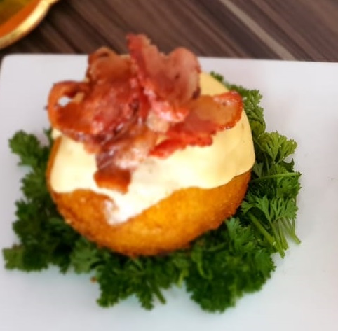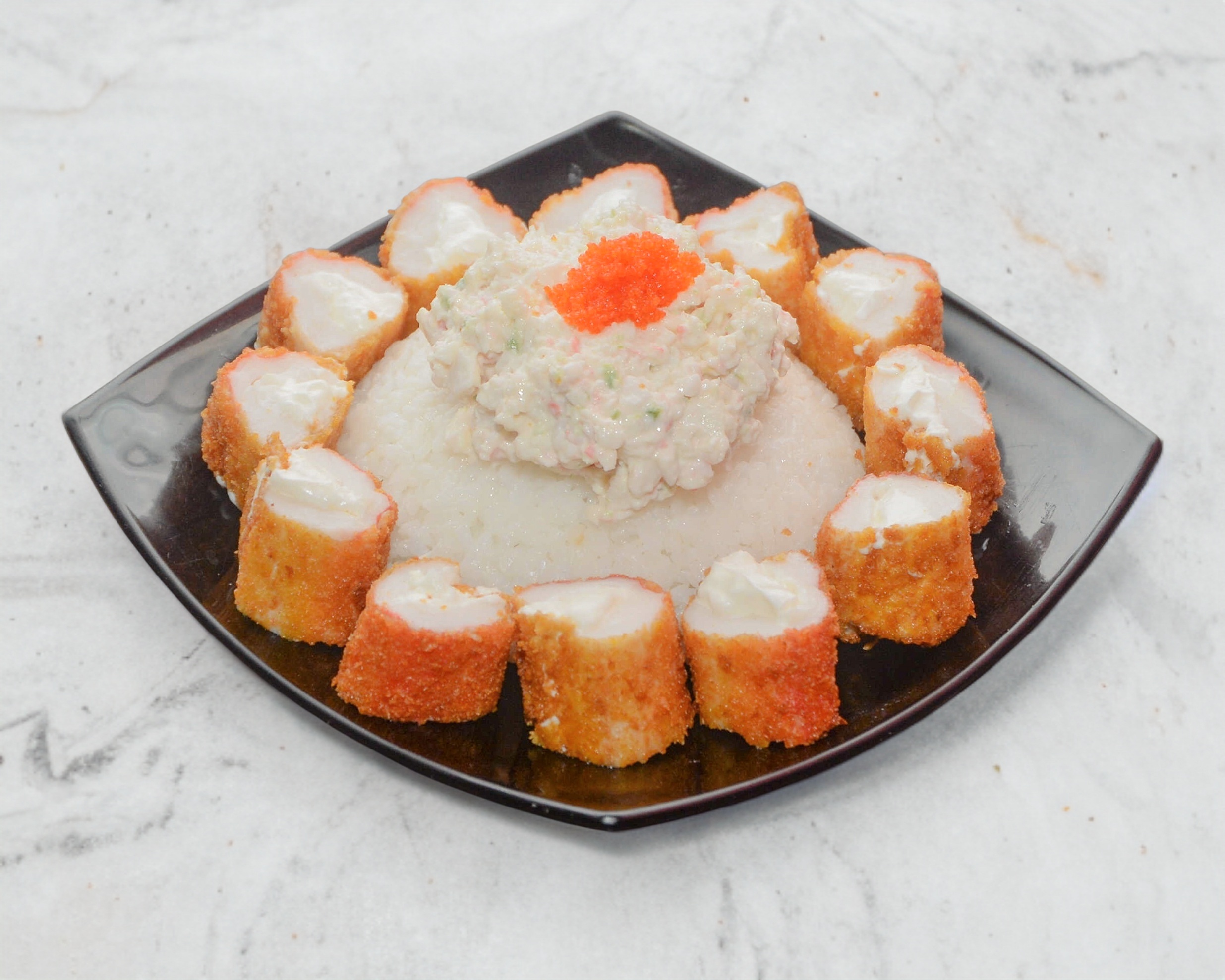 Surimi relleno de philadelphia empanizado, arroz al vapor con tampico.