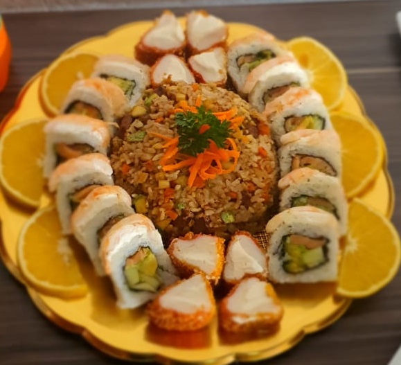 Arroz frito, philadelphia, aguacate, surimi, con el alga por fuera y camarón
