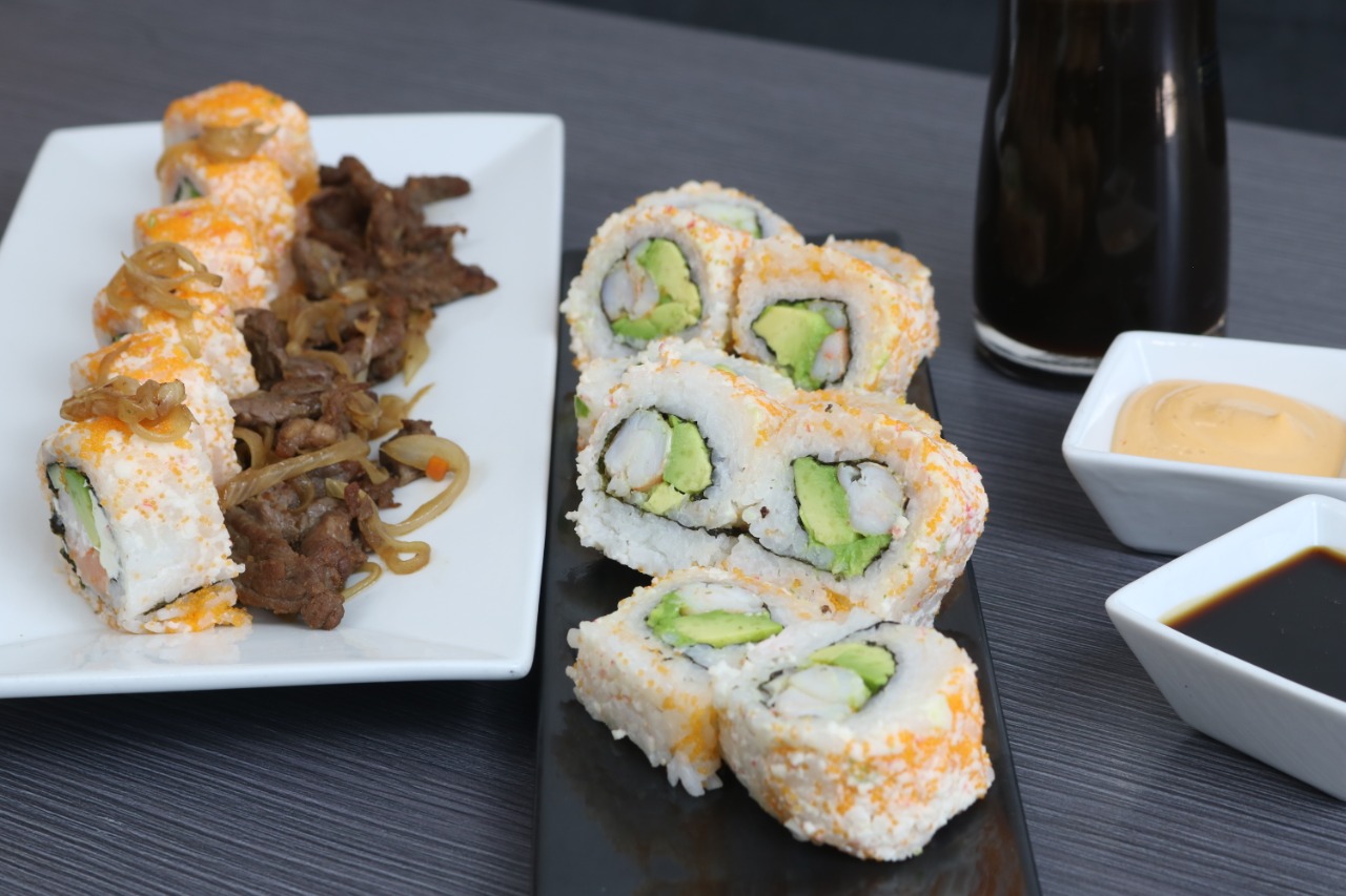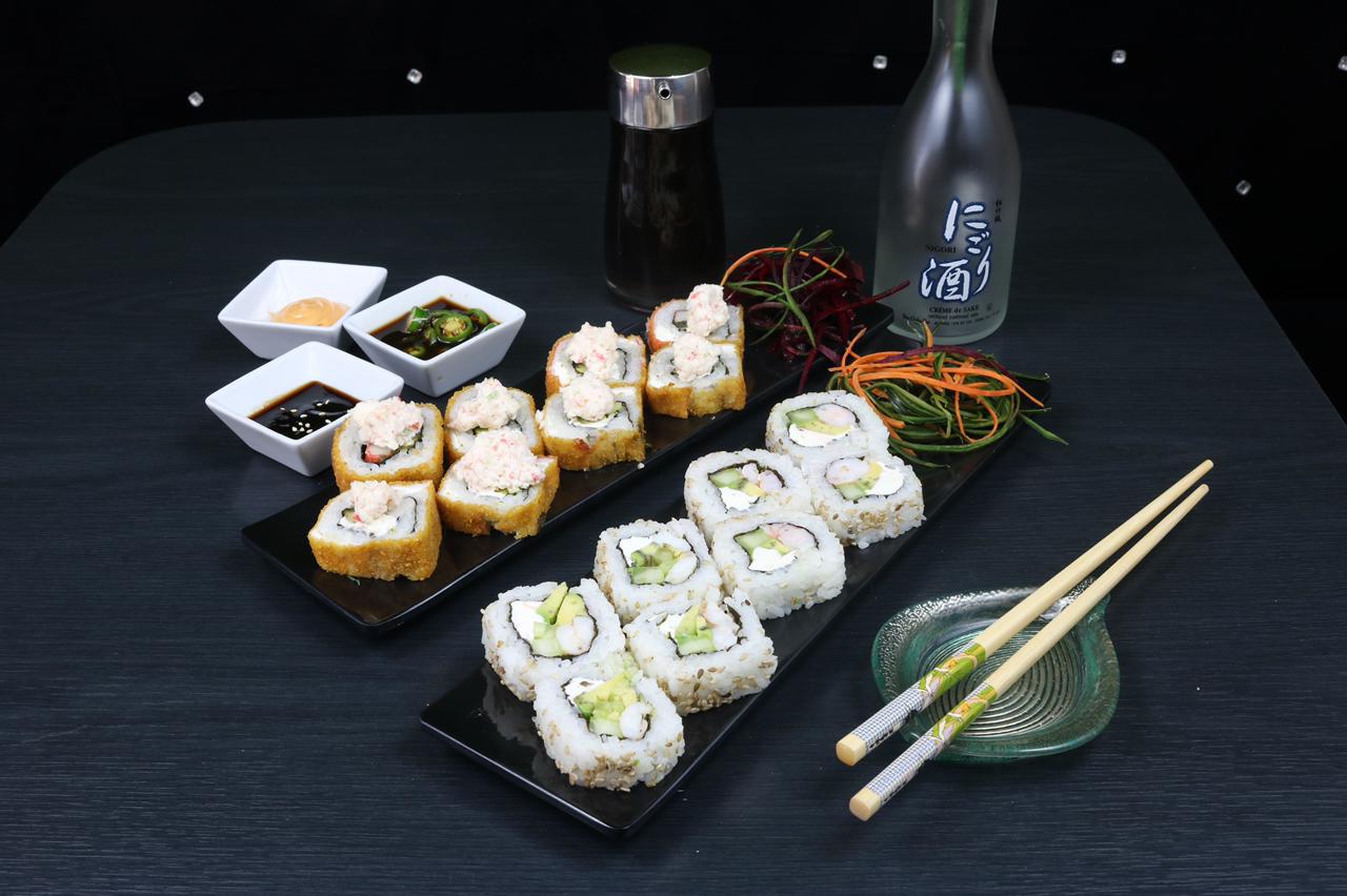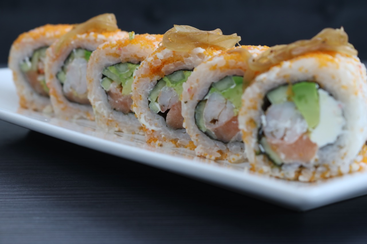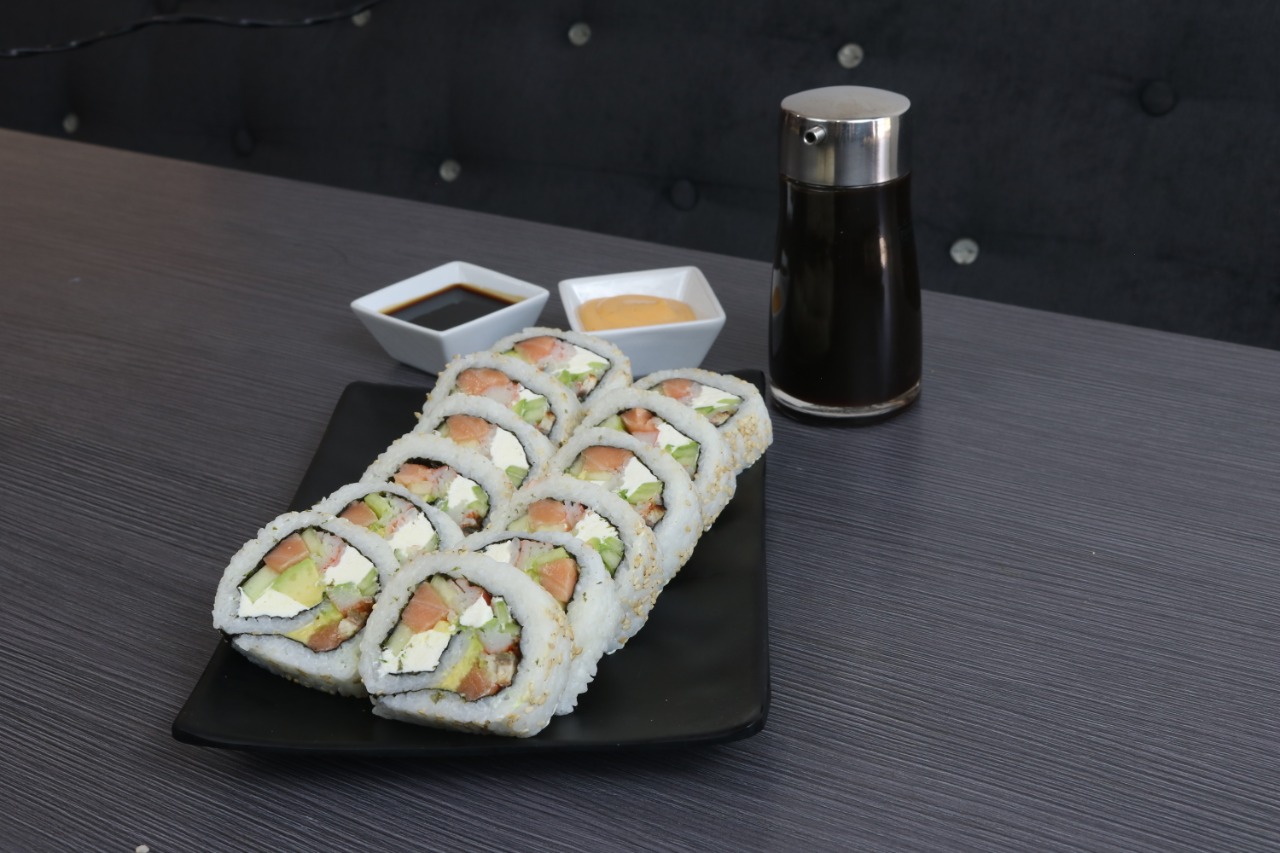 Por dentro Masago, cangrejo, pepino por fuera, salmón, anguila, camarón, philadelphia y ajojolí.