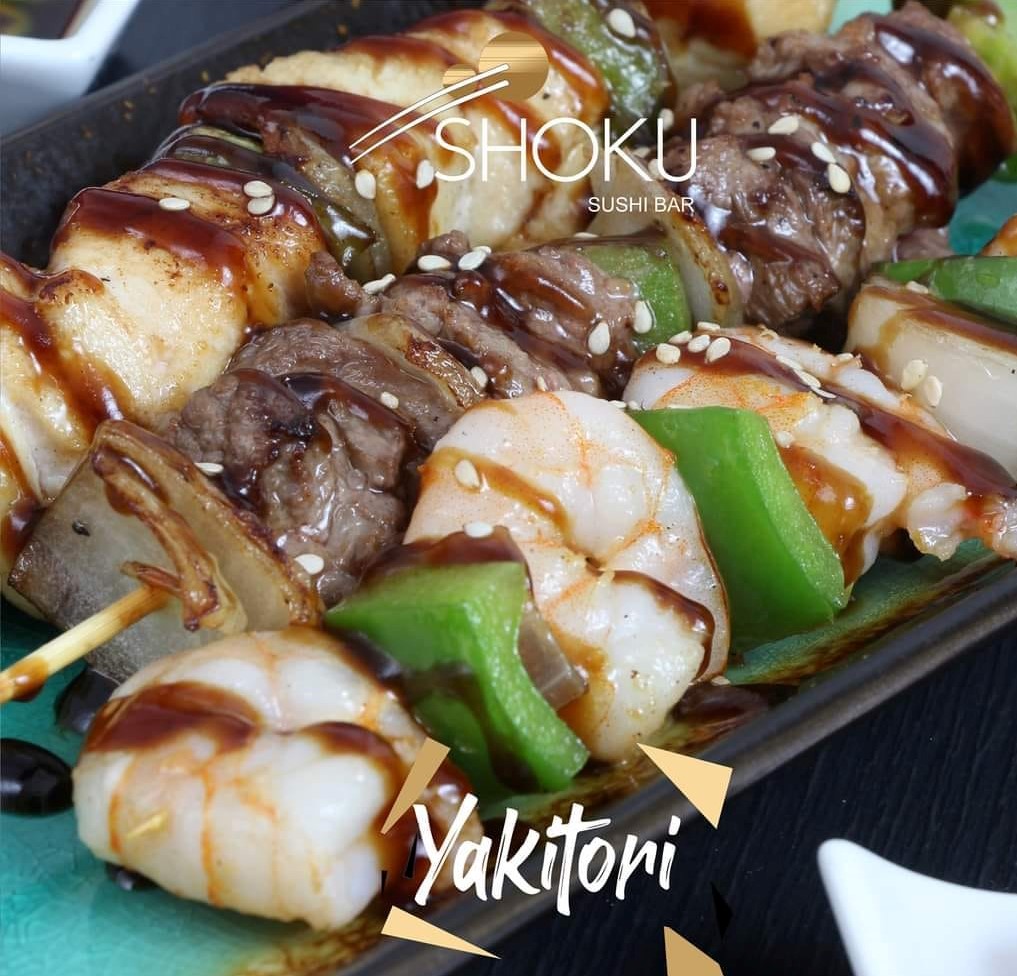 Brochetas de Pollo, Cebolla, Morrón, Bañados en Salsa Teriyaki.