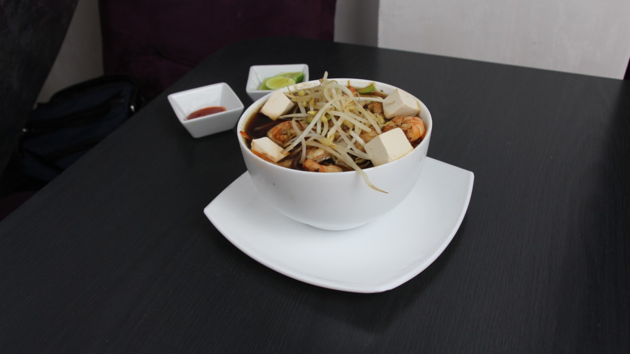 Espaguetti (Pasta japonesa), Pollo, Camarón, Cebolla, Zanahoria, Calabaza y Germen de Soya.