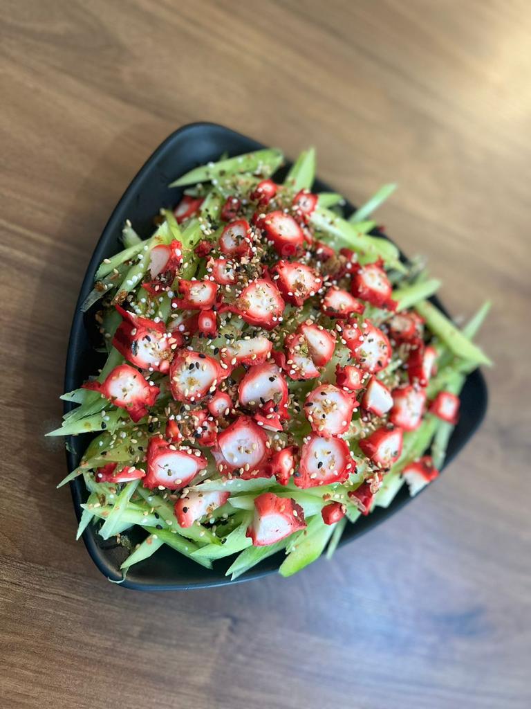 Pepino a la vinagreta con pulpo,surimi,cangrejo,camaron y furikake.