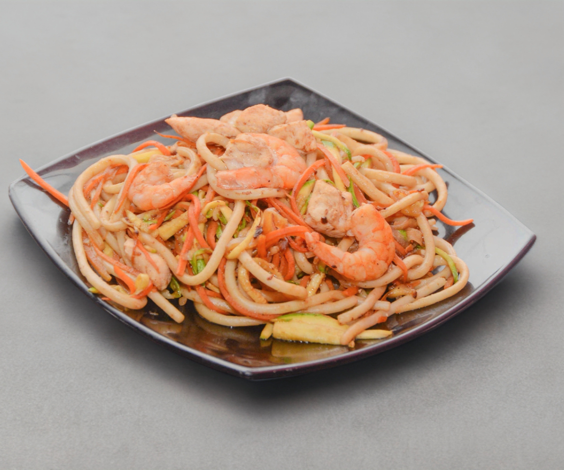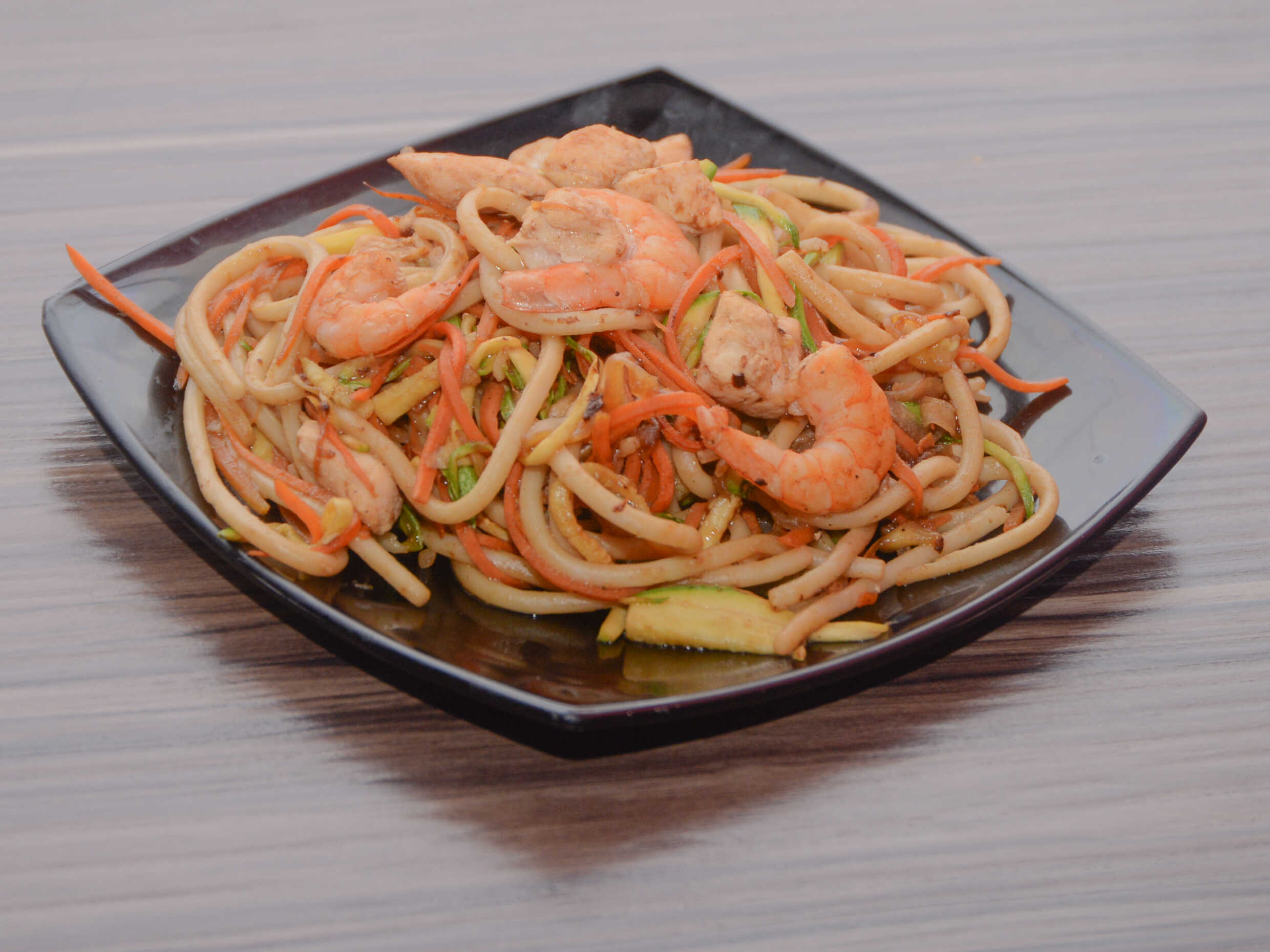 Espaguetti (Pasta japonesa), pollo, camarón, cebolla, zanahoria, calabaza y germen de soya.