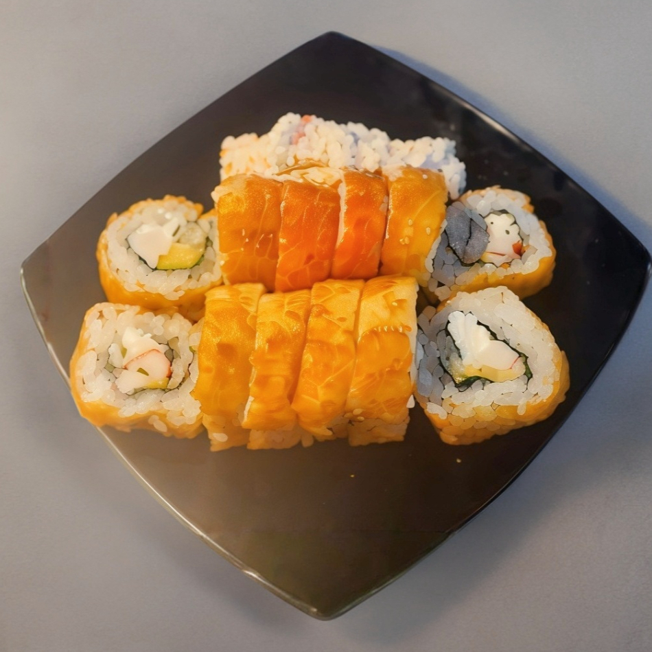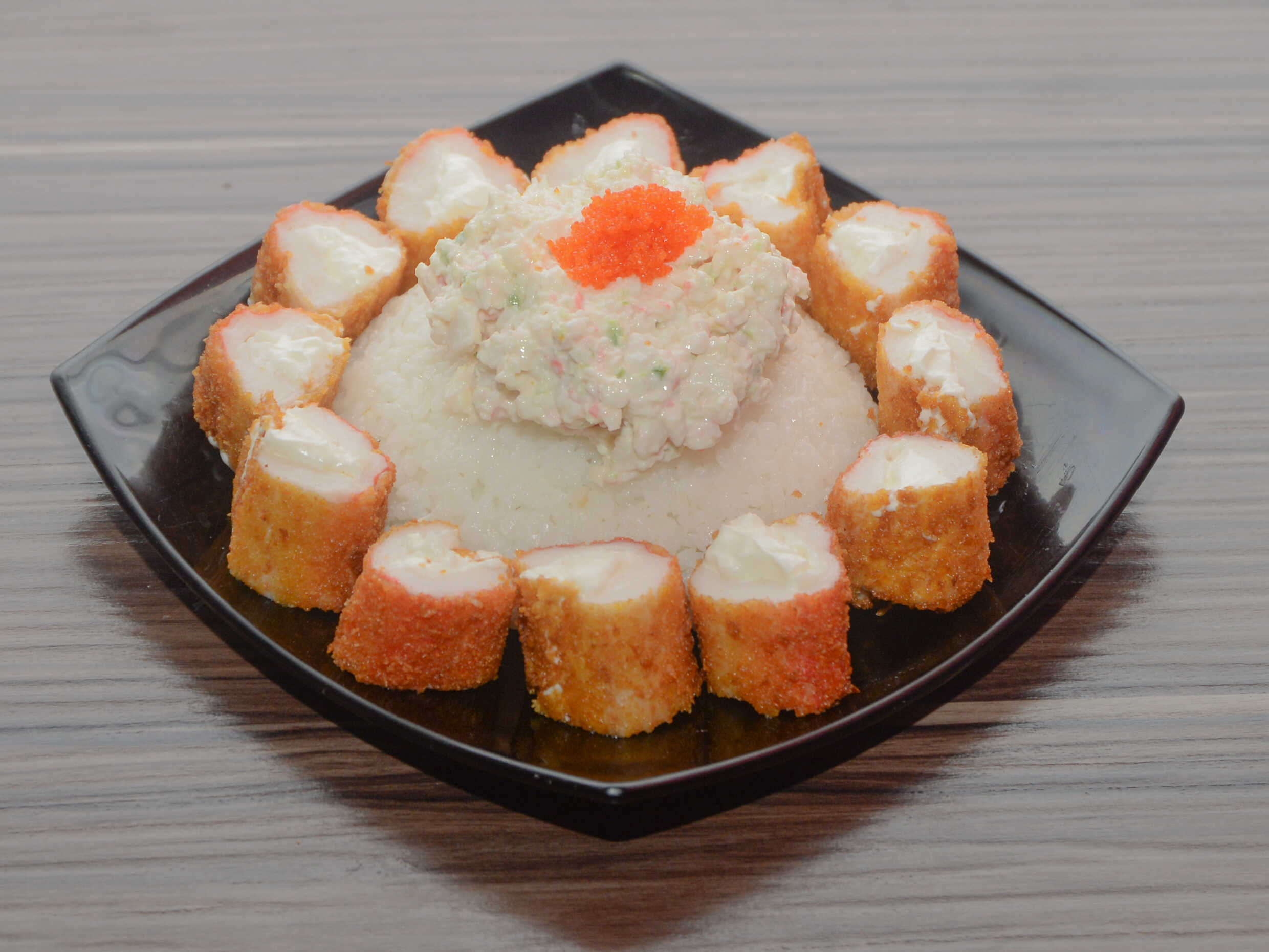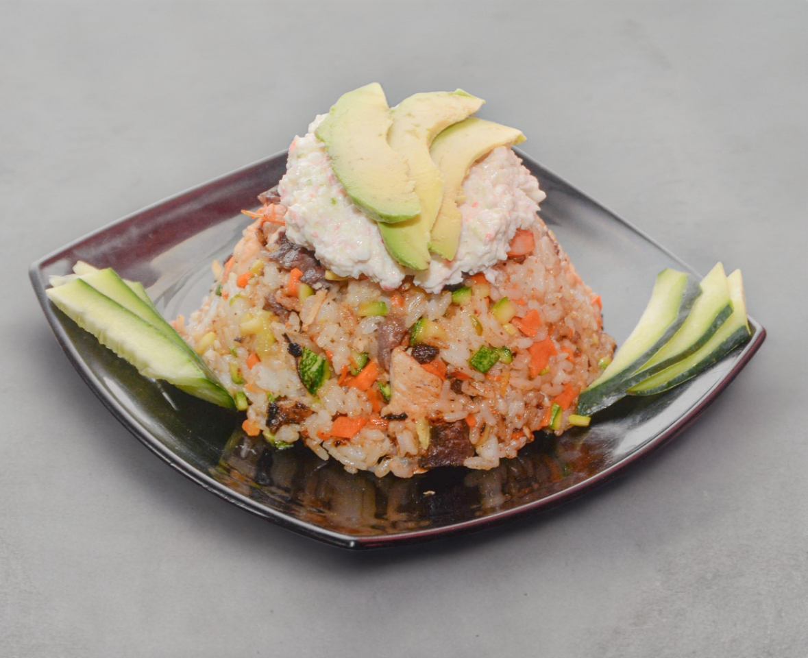 Philadelphia, aguacate, pollo, sirloin , cubierta con arroz frito, empanizada, con topping de tampico, camarones y cebollín.