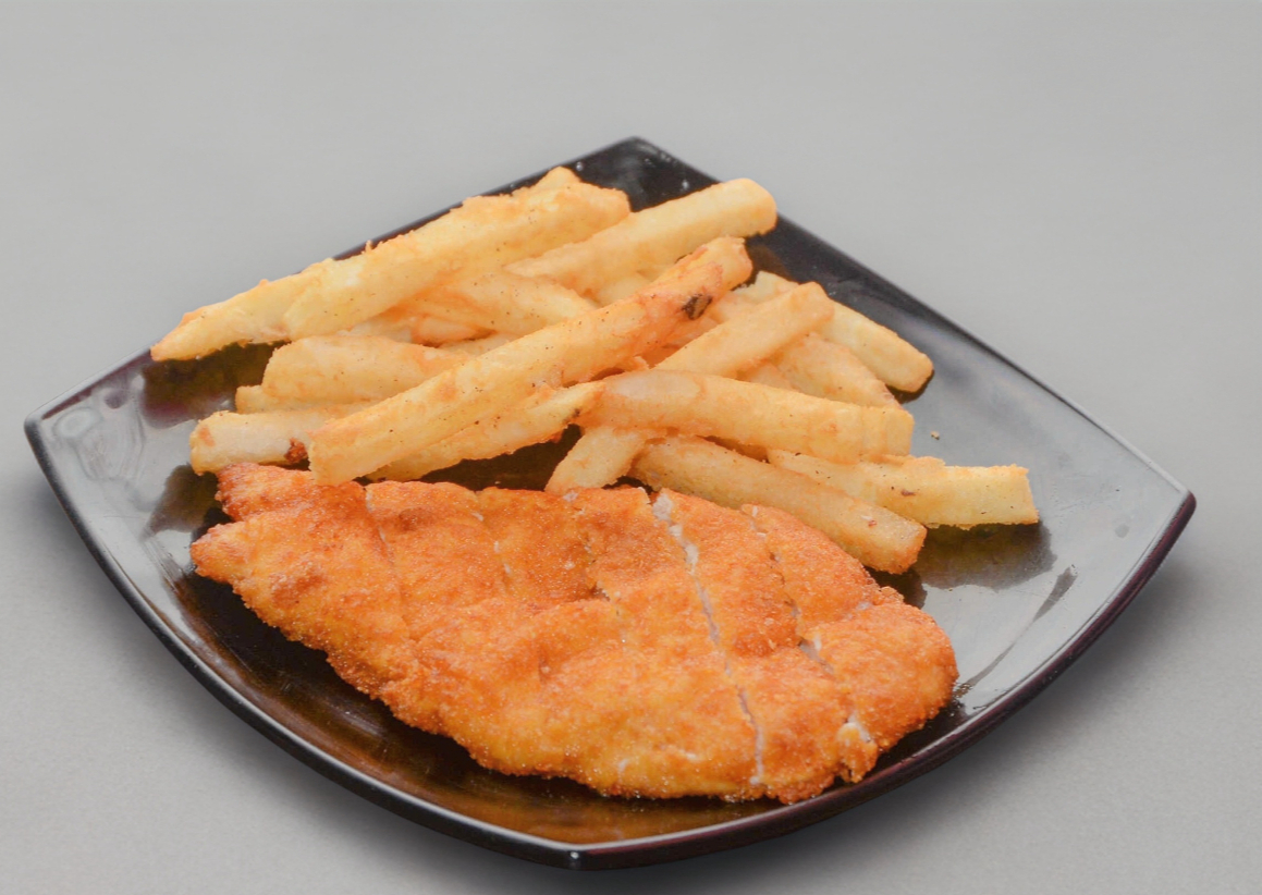 Pescado empanizado 350 g, acompañado de arroz verdura y ensalada de pepino.