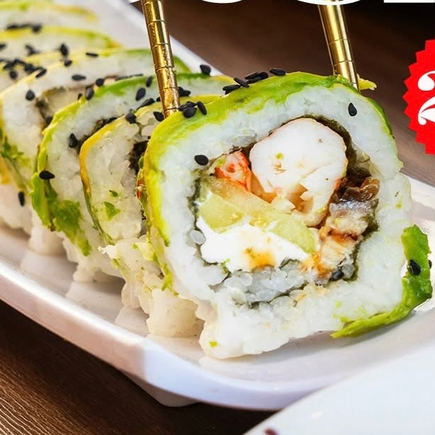 Philadelphia,aguacate,pollo, sirloin , cubierta con arroz frito, empanizada, con topping de tampico, camarones y cebollín.