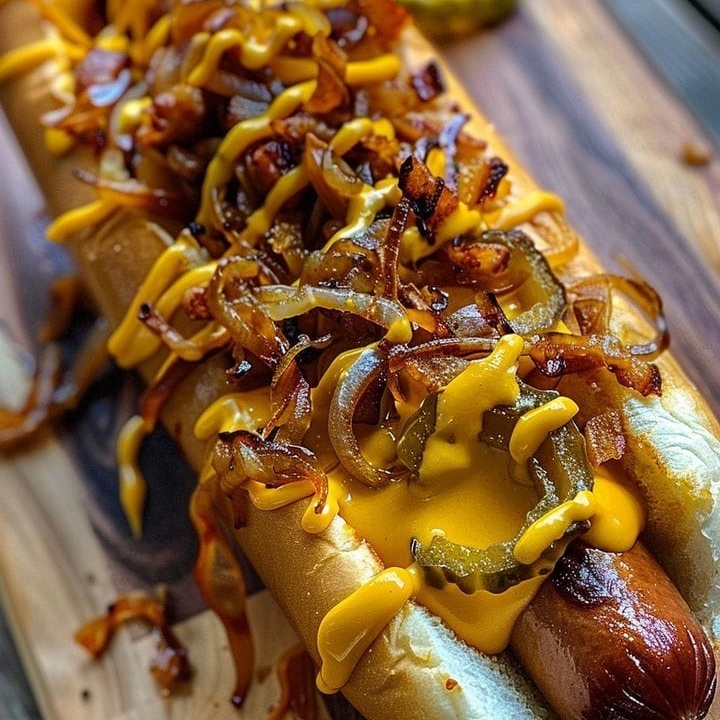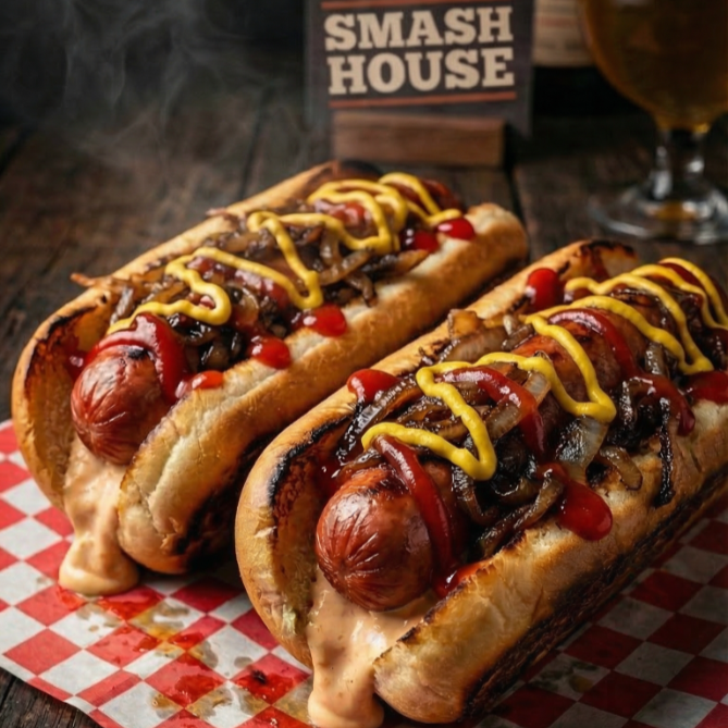 Salchicha clásica con salsa secreta, cebolla caramelizada, y pepinillos en pan tostado.