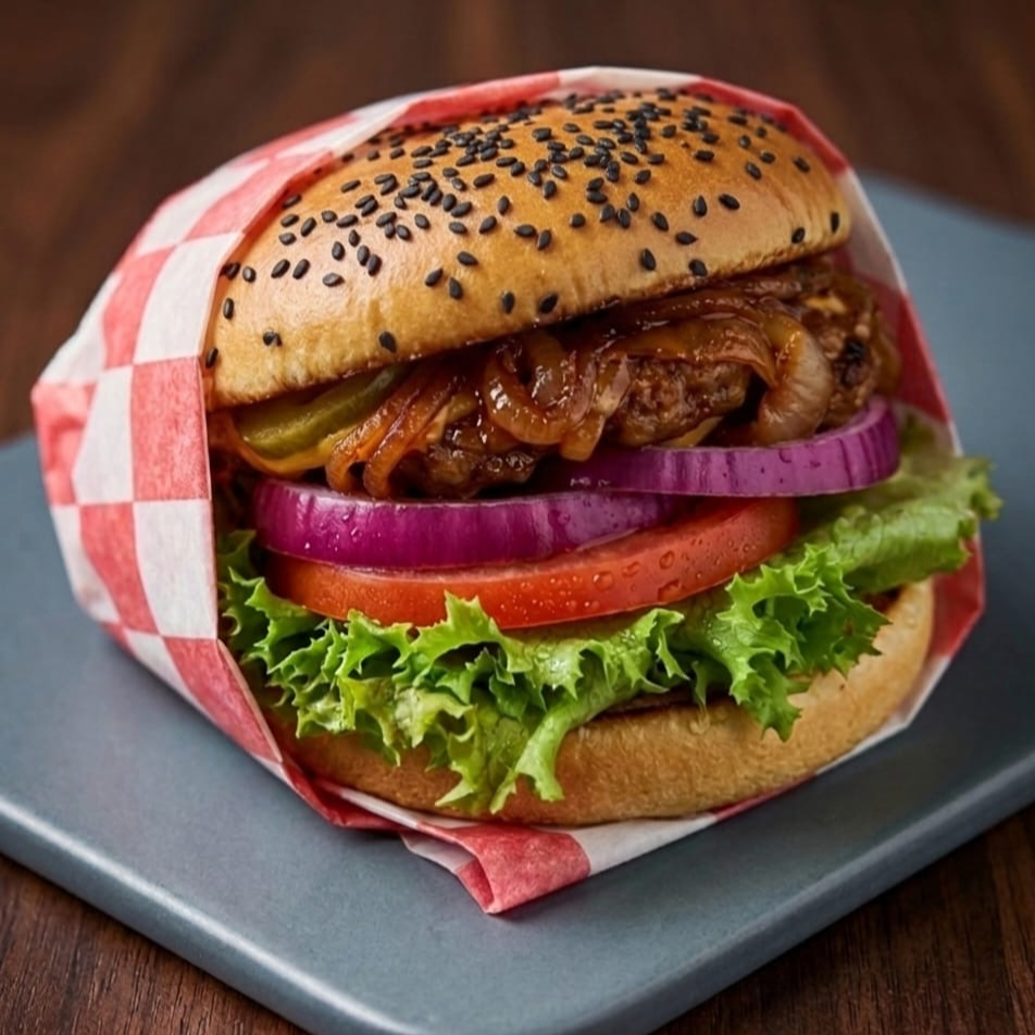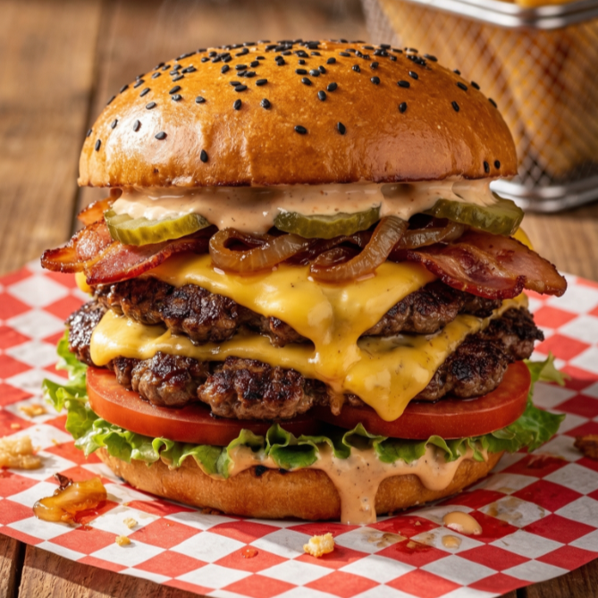 Doble carne smash, doble queso americano, cebolla caramelizada, tomate, lechuga, pepinillos y salsa secreta en pan brioche tostado.