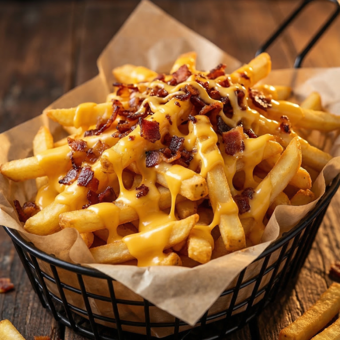 Papas fritas con queso amarillo fundido y trozos de tocino.