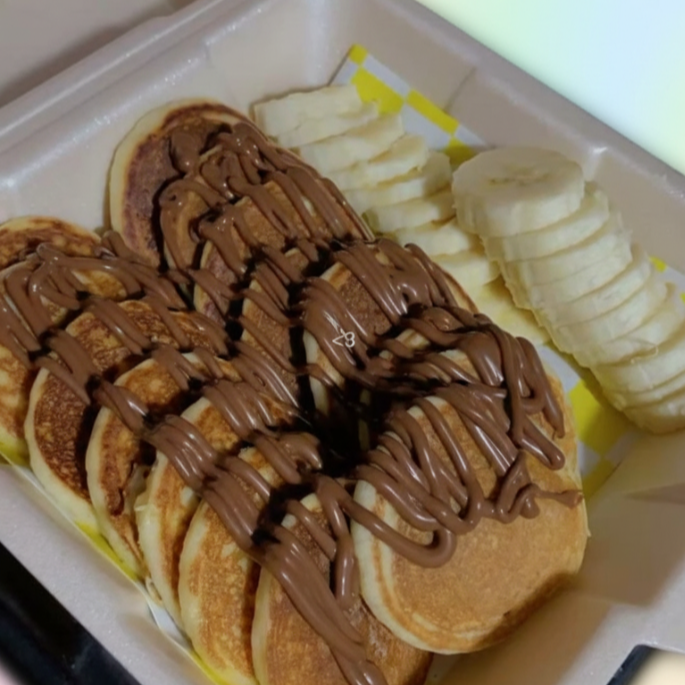 10 mini hot cake con platano ,miel,lechera o mermelada a elegir