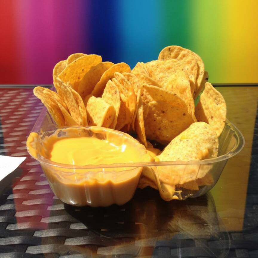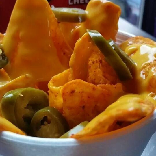Nachos preparados con elote y queso amarillo ,ketchup y salsa