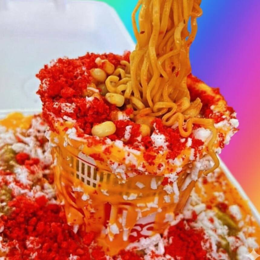 Sopa Maruchan con elote y fritura surtida ,preparada con aderezos y salsas