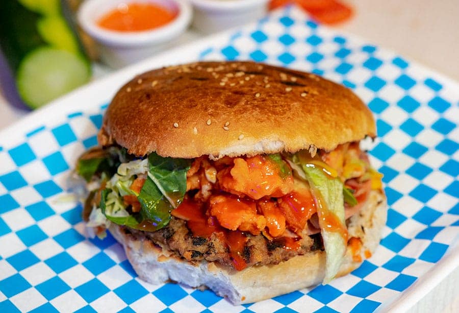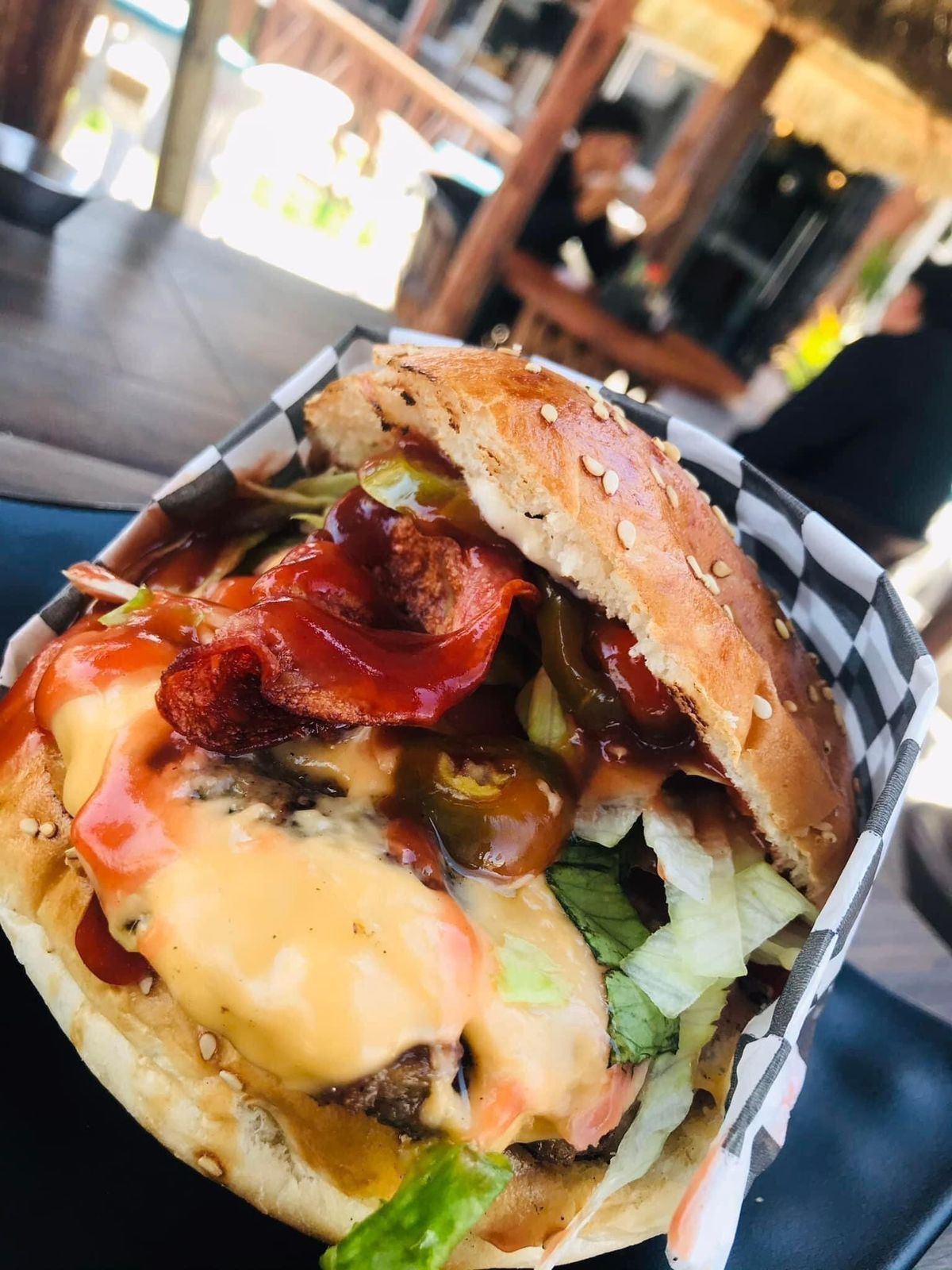 140 grs. de carne a la parrilla, aros de cebolla bañados en salsa BBQ, queso amarillo, chile, jamón, tocino, cátsup, lechuga.