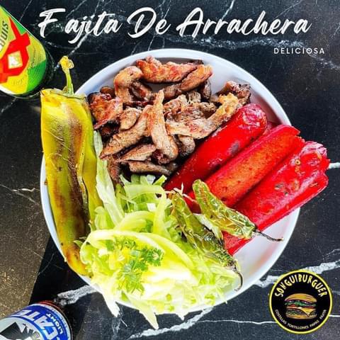 350 grs. de fajita arrachera ( complementos), salchicha asada, chilaca, ensalada, limones, salsas, tortillas.