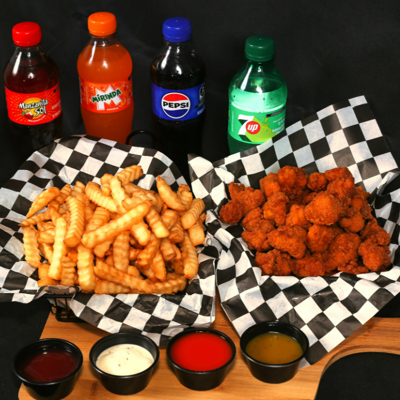 Incluye 2 combos clásicos: 400g de boneless en total, 2 porciones de papas, 2 refrescos de 400ml y salsa ranch y cátsup. La opción ideal para una comida completa en pareja.