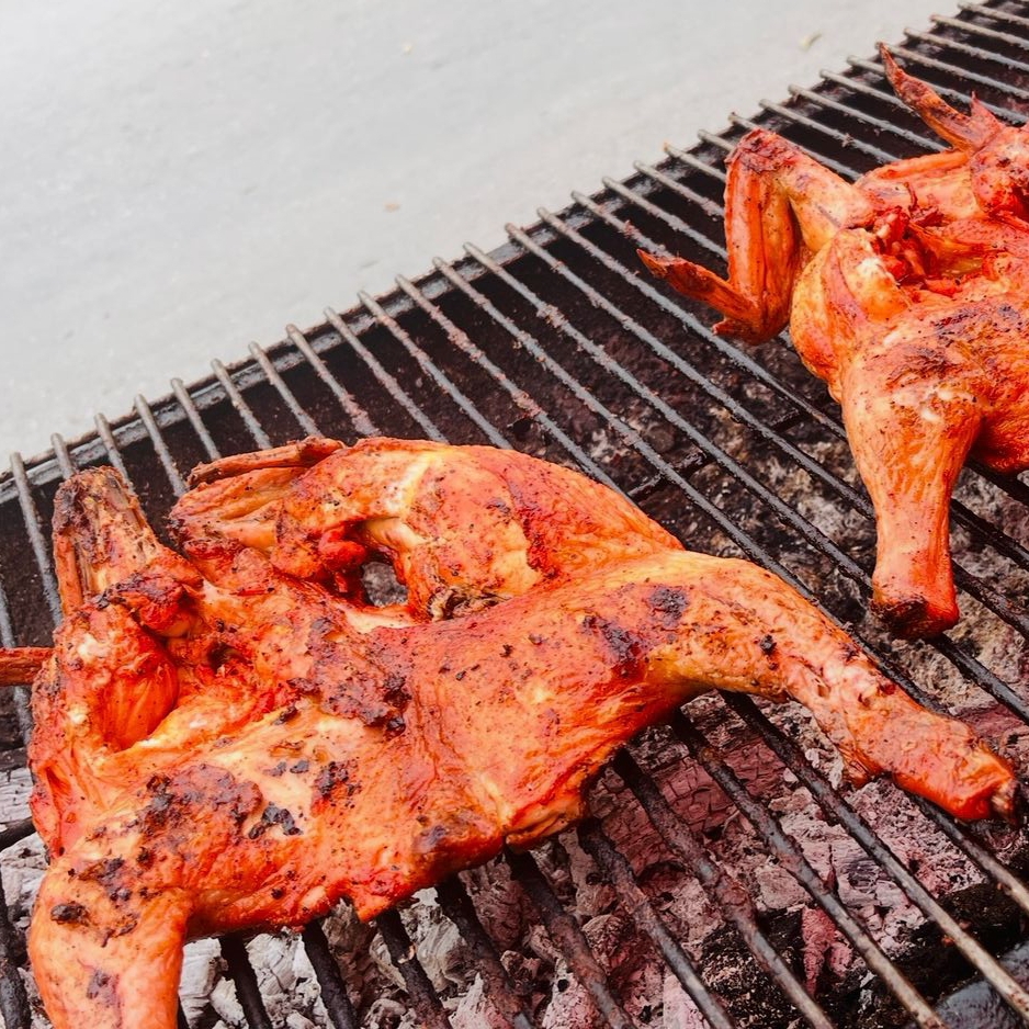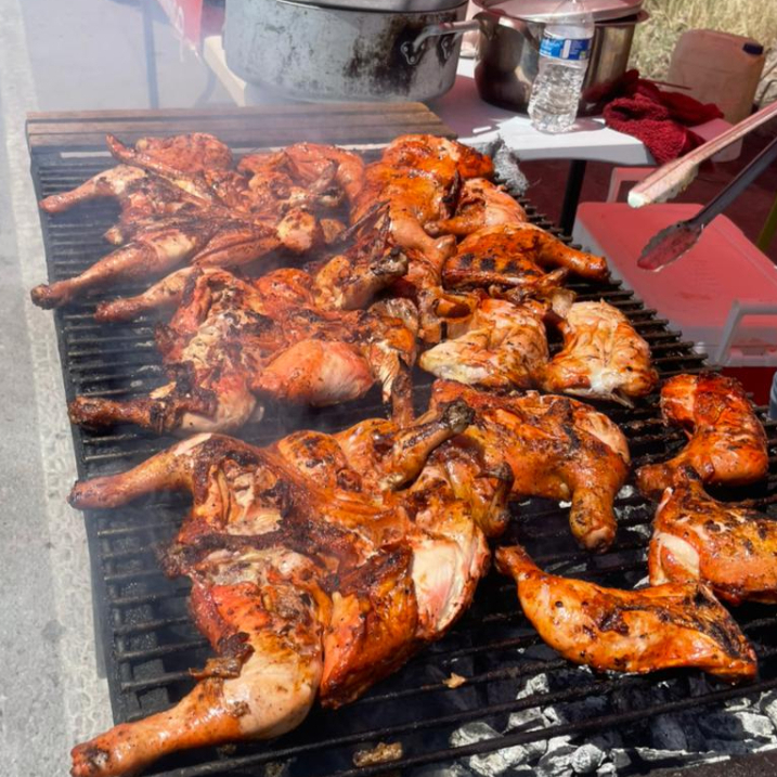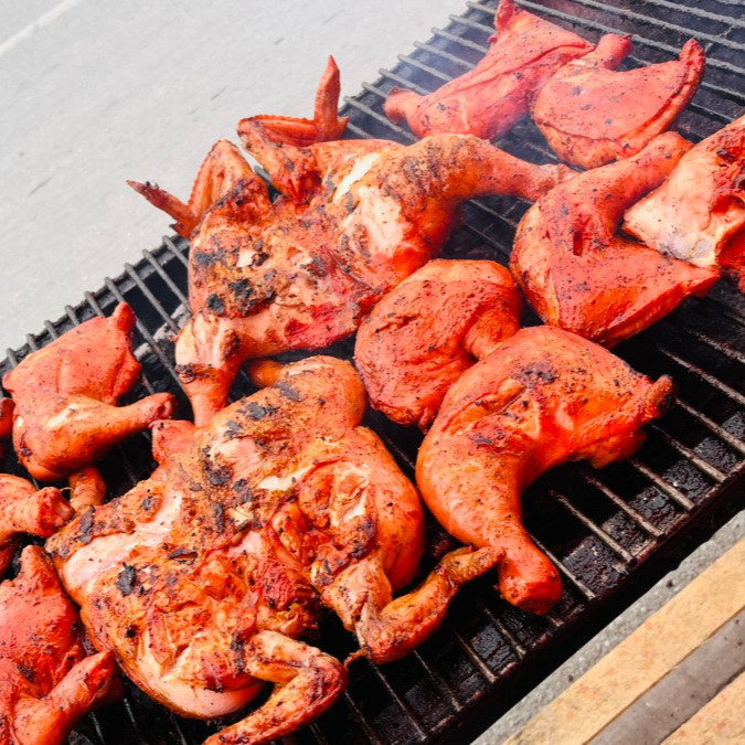 Delicioso pollo completo cocinado lentamente al carbón, servido con arroz, salsa y tortillas.