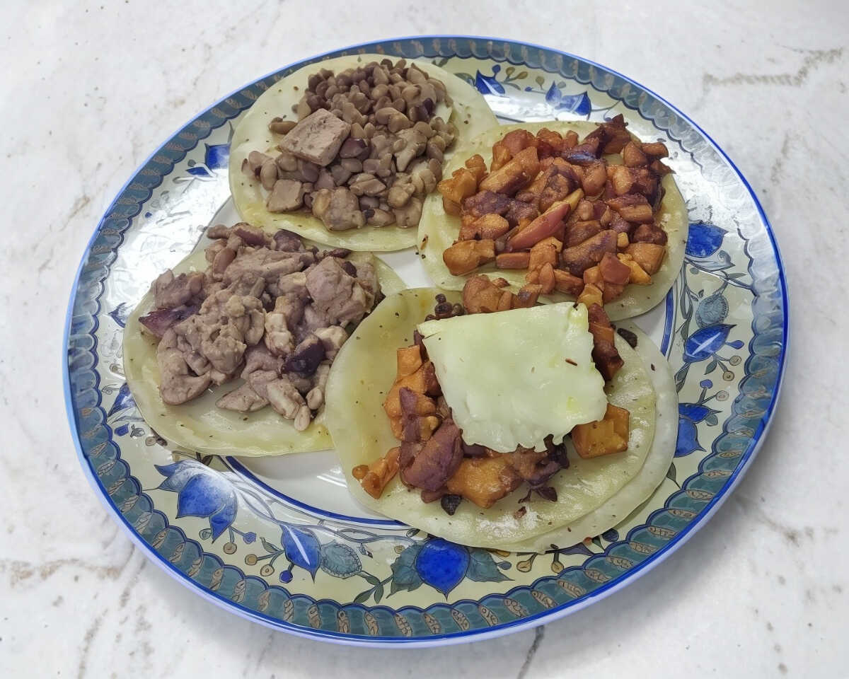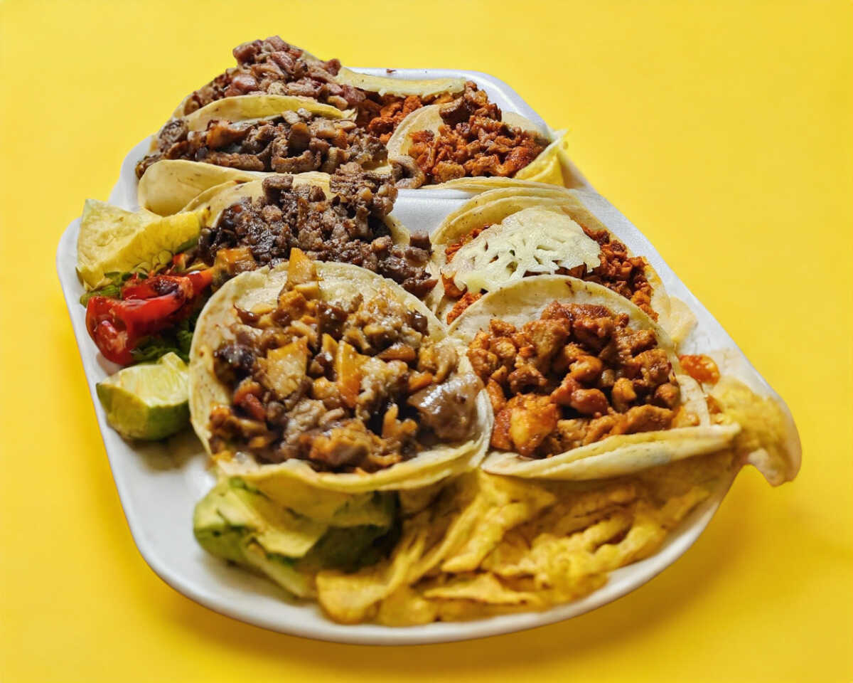 Variedad de deliciosas carnes ,troceada lista para taquear, queso gratinado acompañado de cebolla caramelizada, salsas, verduras, tortillas de maíz