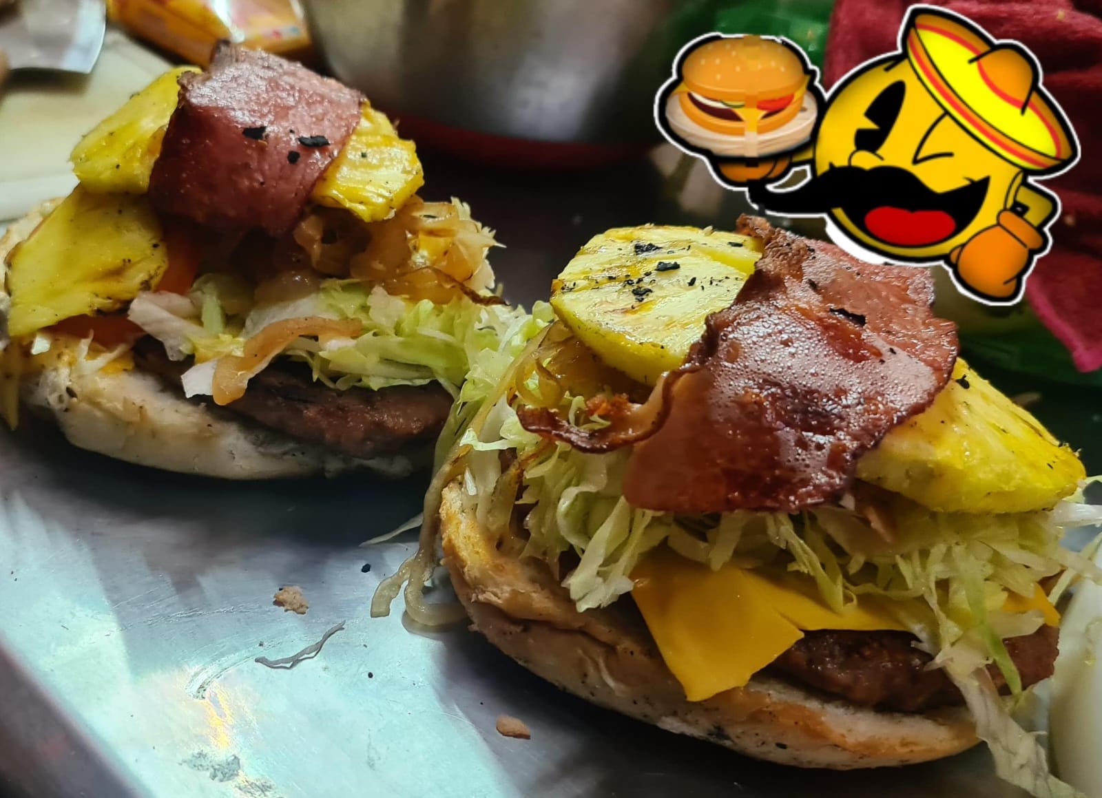 Carne de res, jamón, tocino, queso amarillo, piña, cebolla frita, lechuga , tomate ,chile, cátsup, mostaza