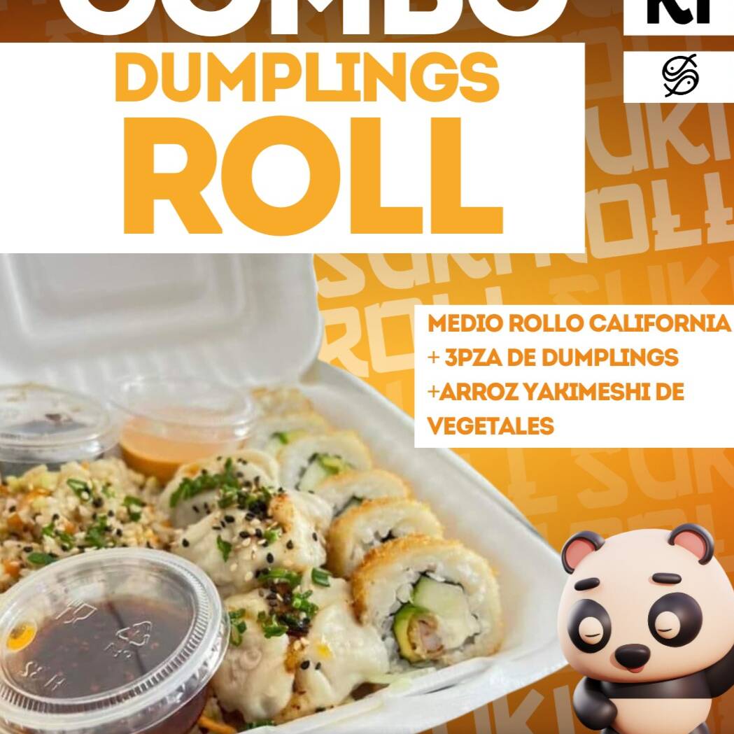 Medio rollo a tu elección. 3 Piezas de dumplings y arroz yakimeshi de verduras. Acompañado de salsa de anguila, salsa mulata, soya con limón y mayonesa con chipotle.