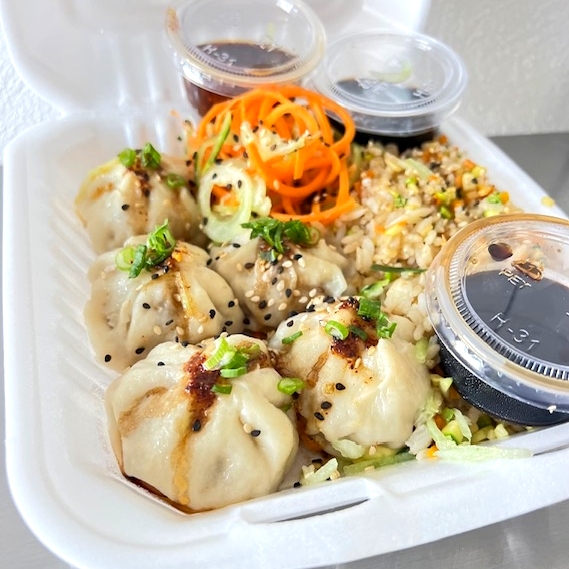 5 Piezas de dumplings rellenos de carne con vegetales. Acompañado de yakimeshi de vegetales y ensalada.