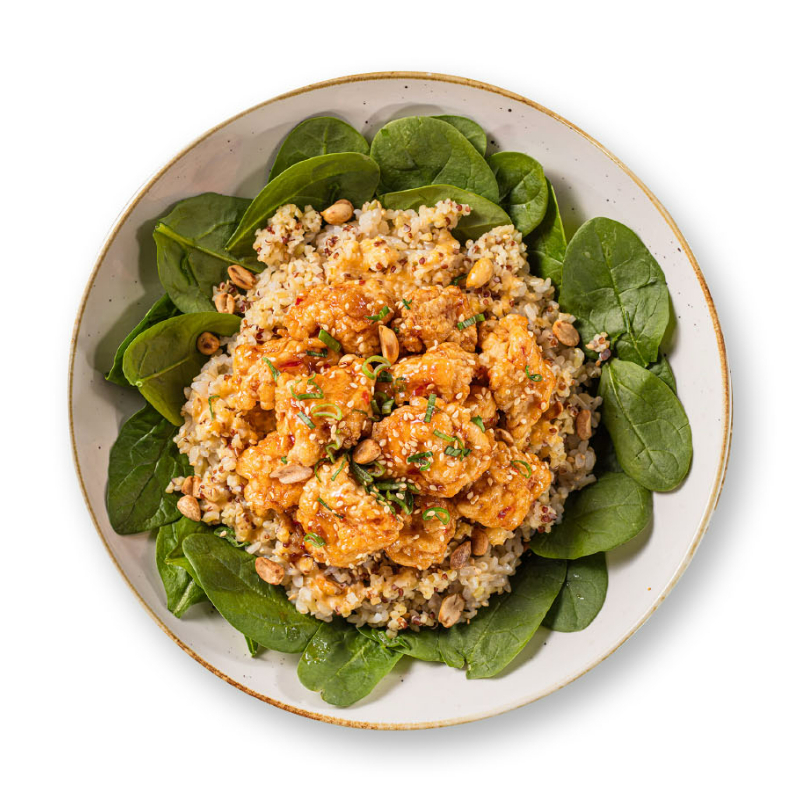 Brown rice y quinoa, pollo thai, espinaca, ajonjolí y cacahuate tostado, cebollín , salsa Sweet Chilli y aderezo Mango Sriracha.