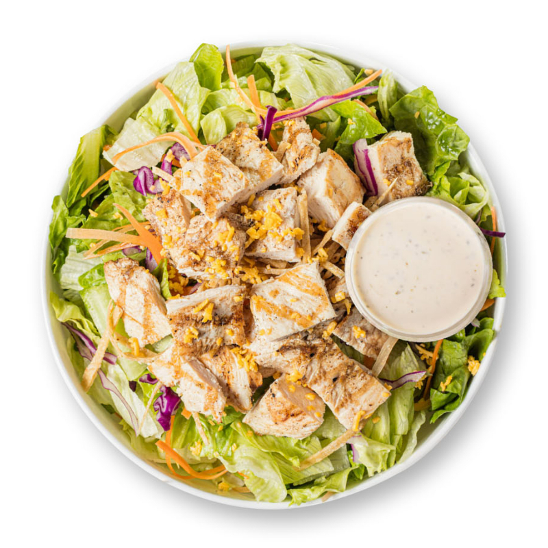 Pollo, lechuga mixta, zanahoria, col morada, frituras, queso cheddar y aderezo Ranch.