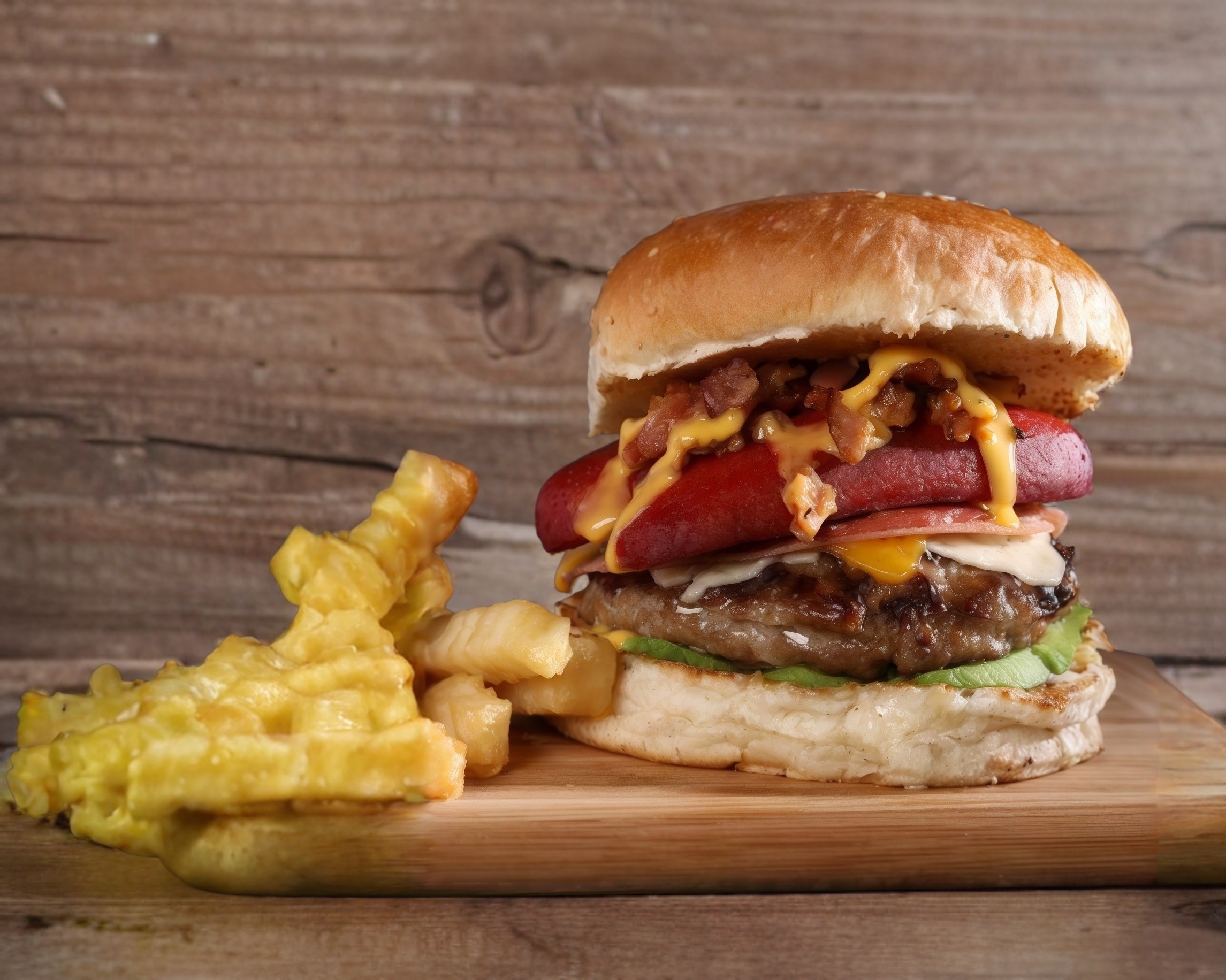 salchicha asar, queso, tocineta, cebolla, tomate y aderezos