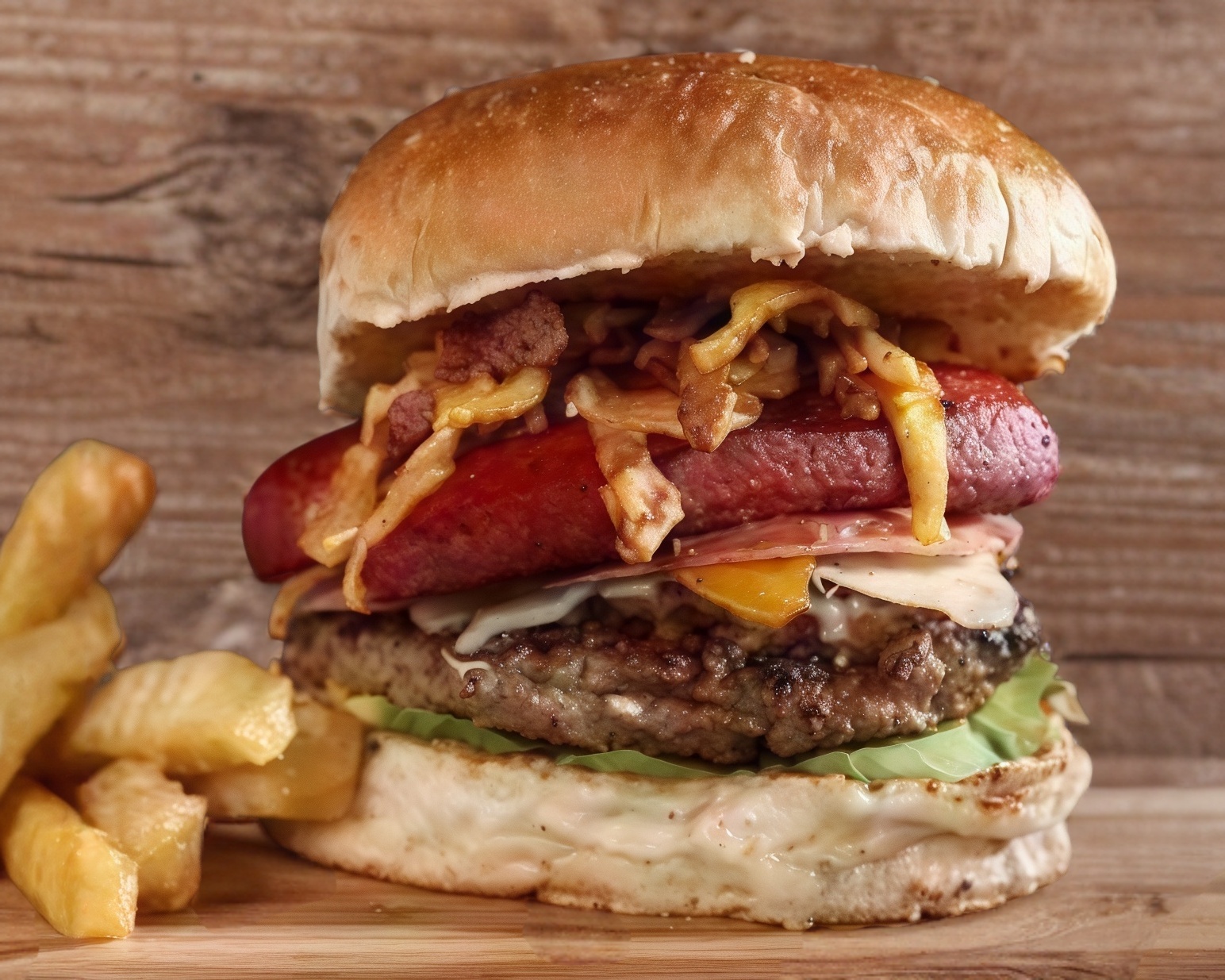 Pan tradicional con carne casera, tocino, jamón, queso, lechuga, cebolla, tomatey aderezos.