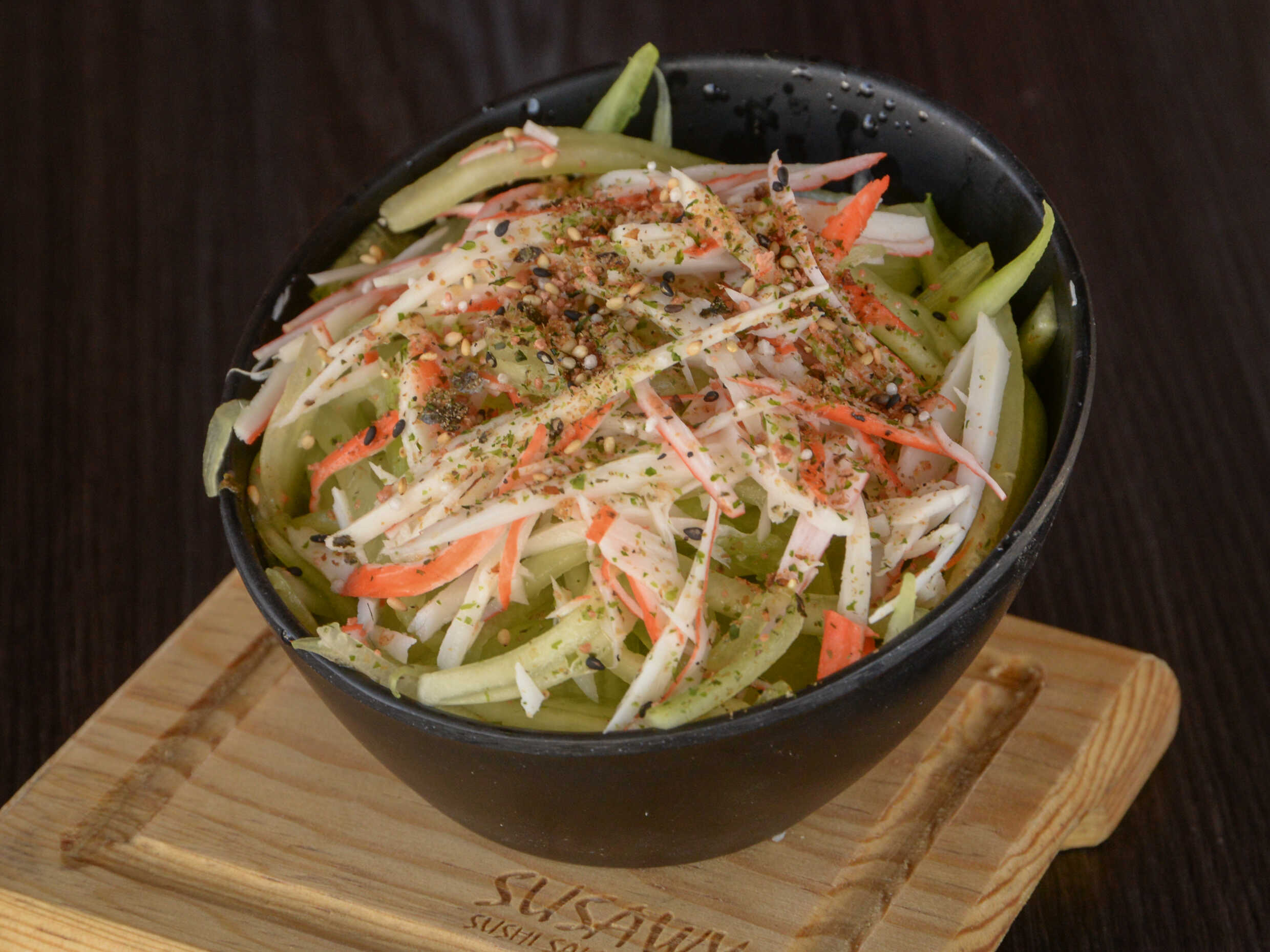 Pepino, surimi, furikake. Aderezado con vinagre de arroz.