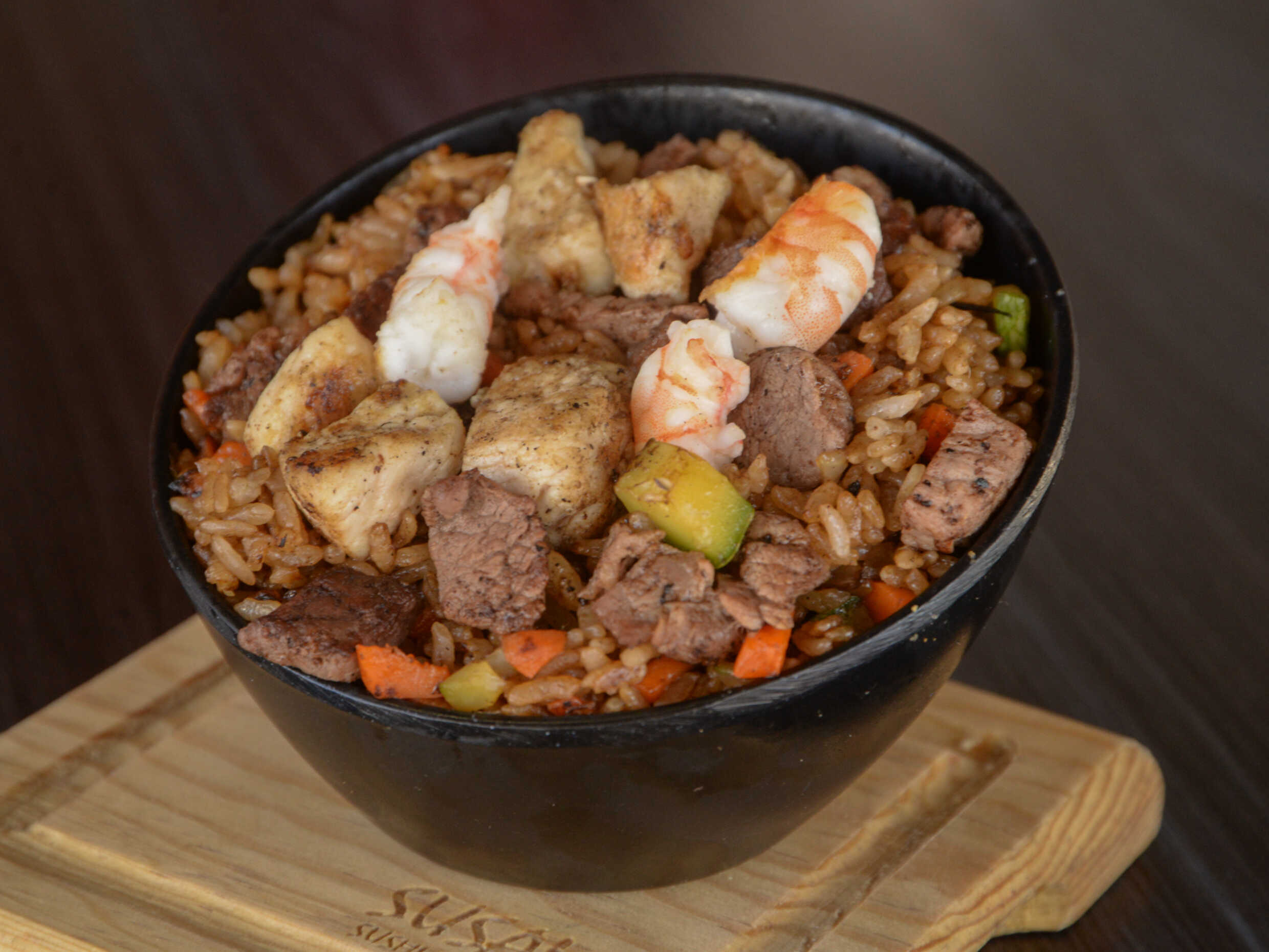 Zanahoria, calabaza, cebolla blanca, arroz, sirloin, pollo y camarón. Todo sazonado con soya y mantequilla y el toque de la casa.