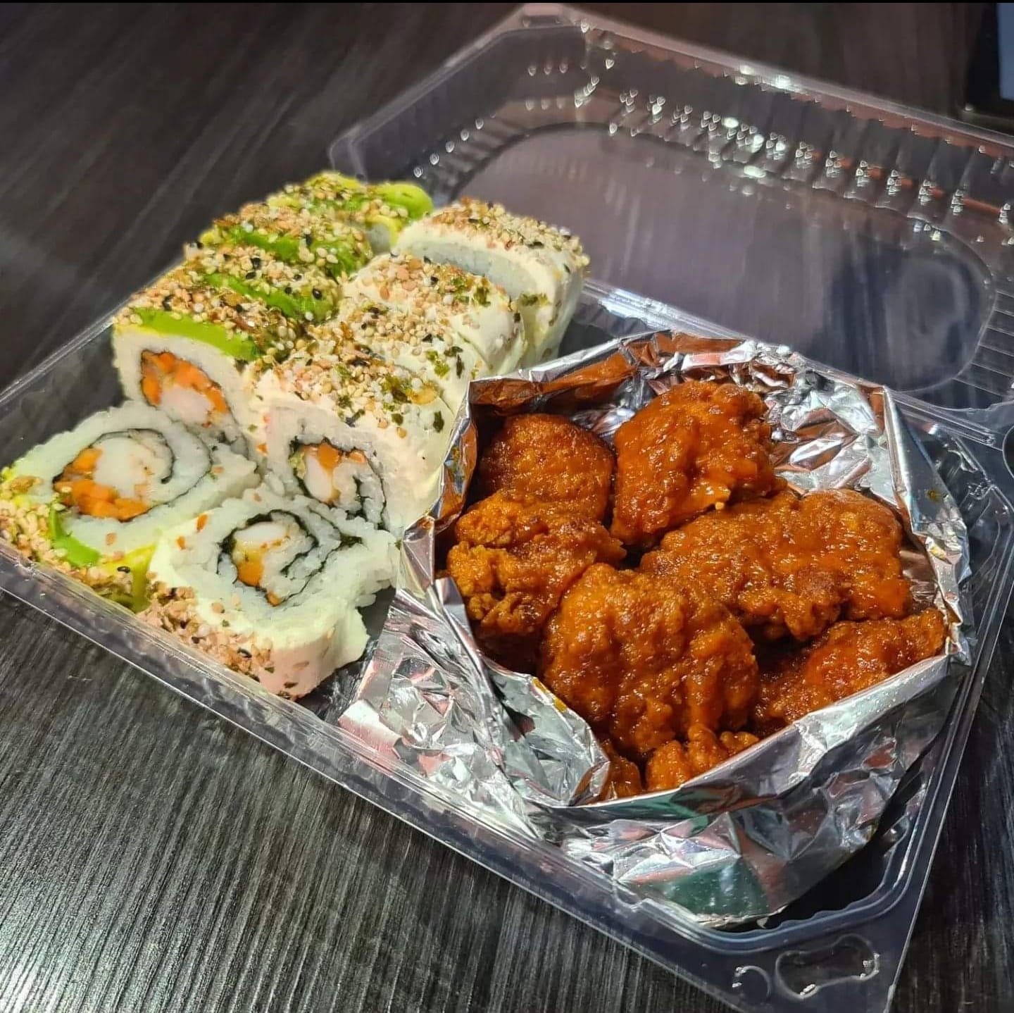 Rollo con alga por fuera, por dentro queso crema y aguacate. Por fuera pollo, queso gratinado, acompañado de salsa dulce y cama de kakiague.