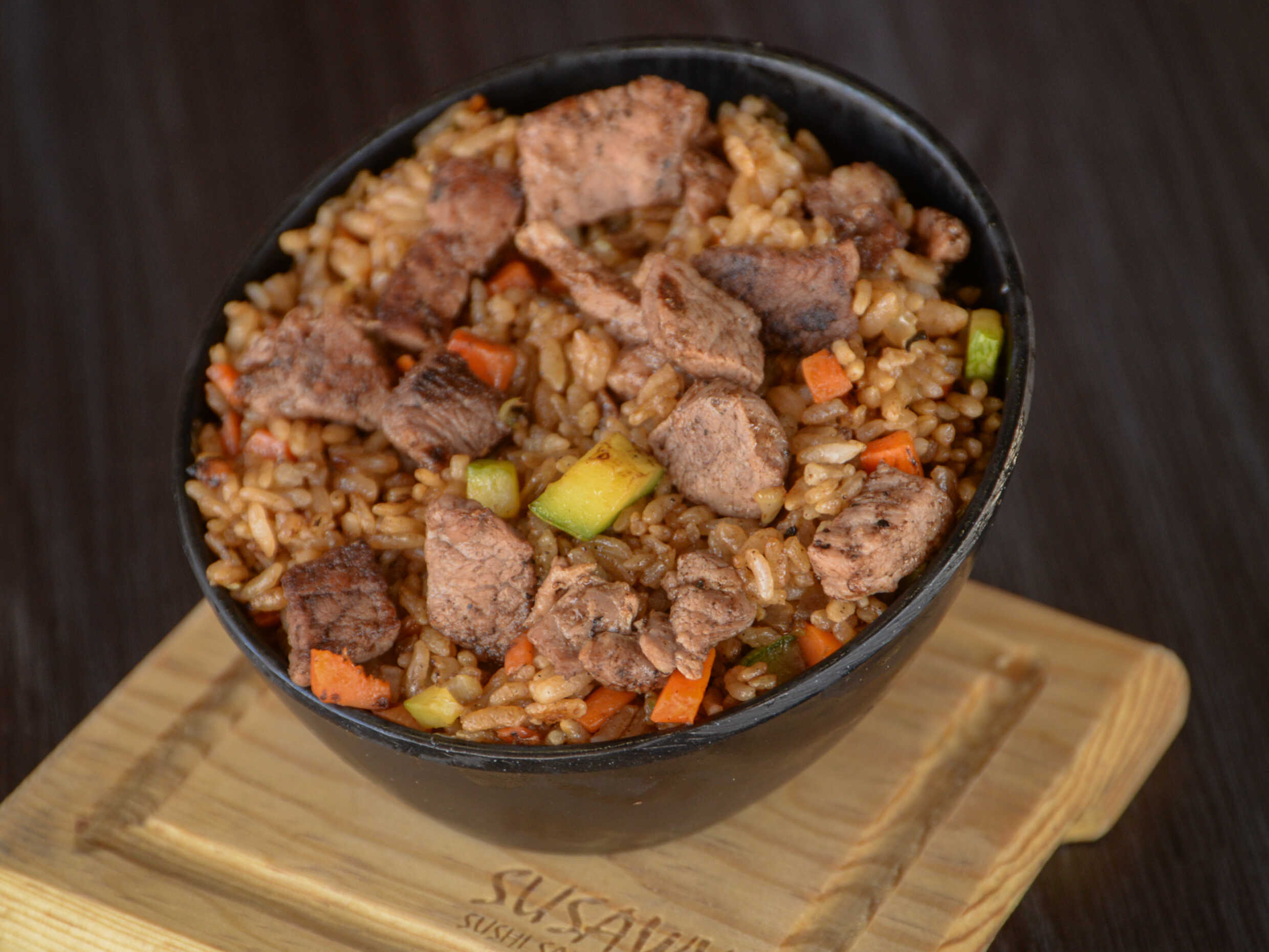 Zanahoria, calabaza, cebolla blanca, arroz y sirloin. Sazonados con soya, mantequilla y el toque de la casa.