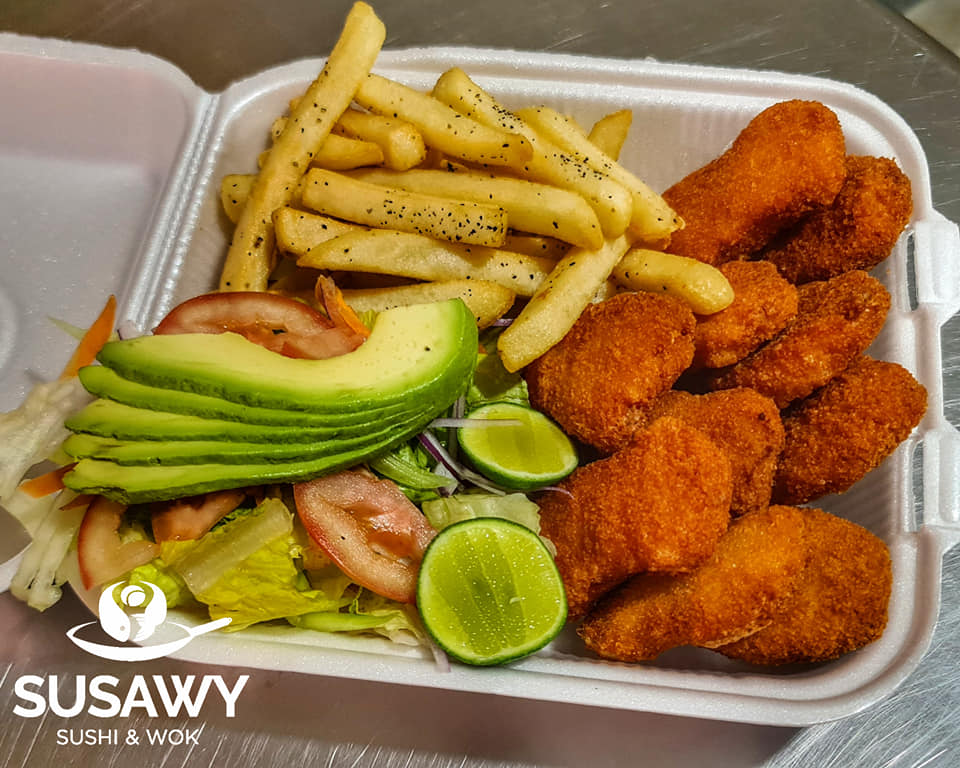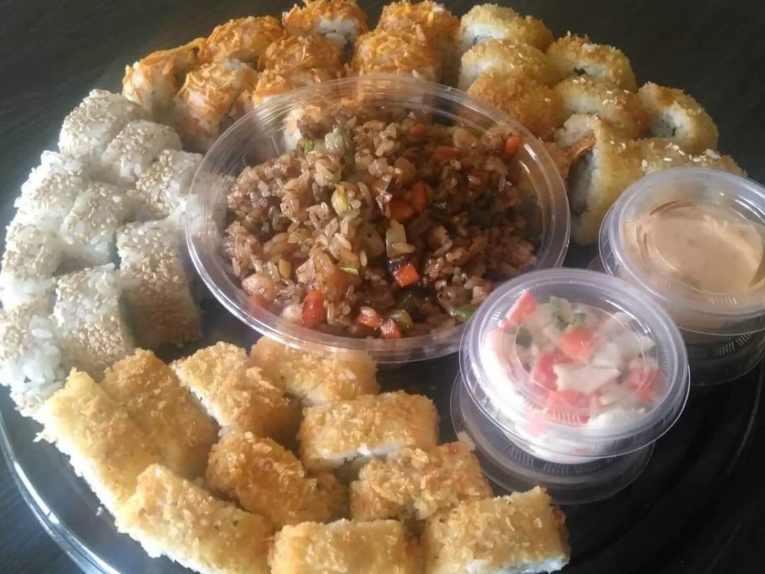 3 Rollos a elegir de los clásicos, porción de papás a la francesa, porción de ensalada, porción de arroz de verduras, trozos de pescado empanizado y 18 pz de Camarones preparados de 3 formas distintas. (Empanizado, a la mantequilla y picantes).