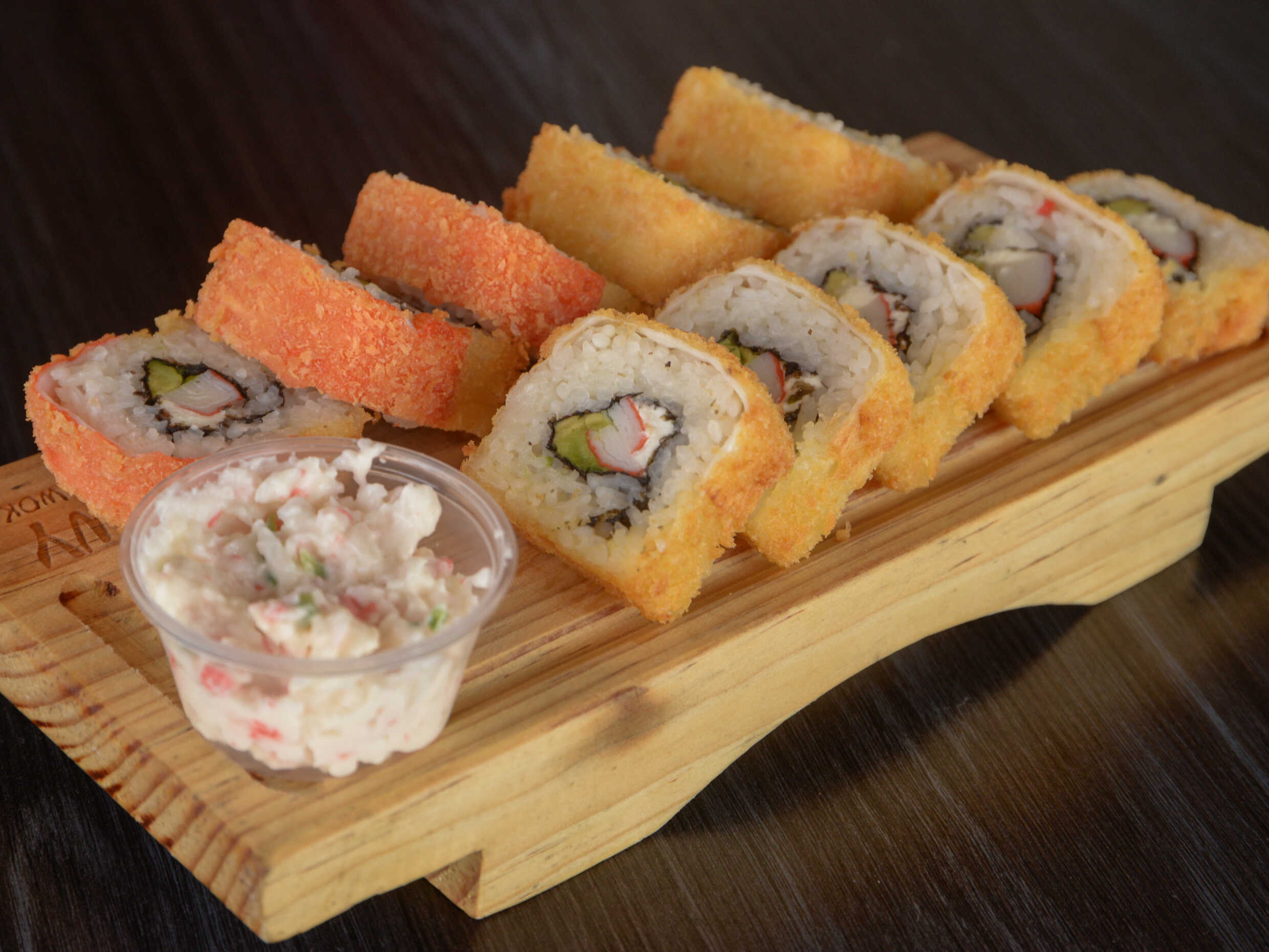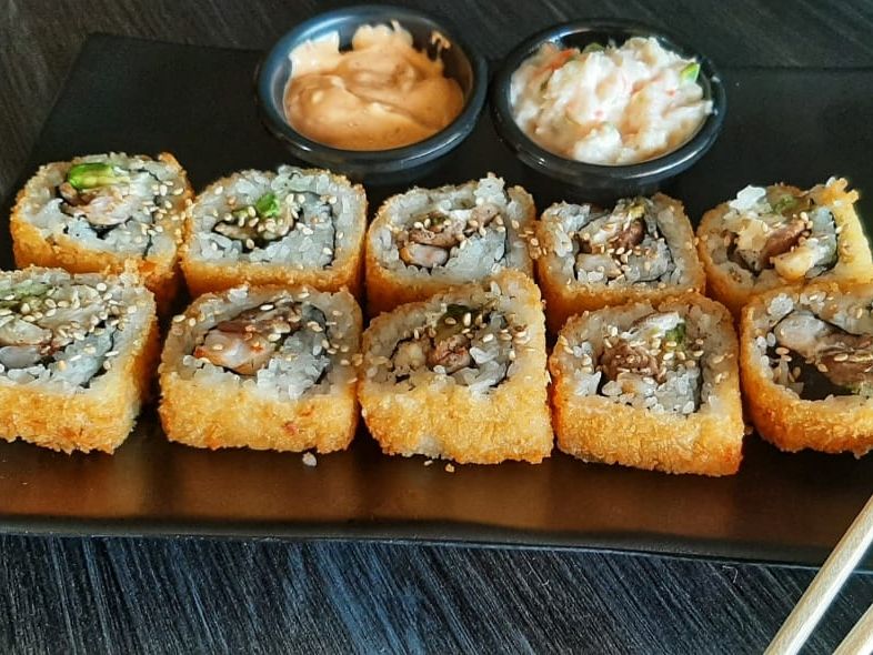 Por dentro aguacate, pepino, queso crema, surimi y camarón cocido. Por fuera empanizado acompañado con salsa dulce.