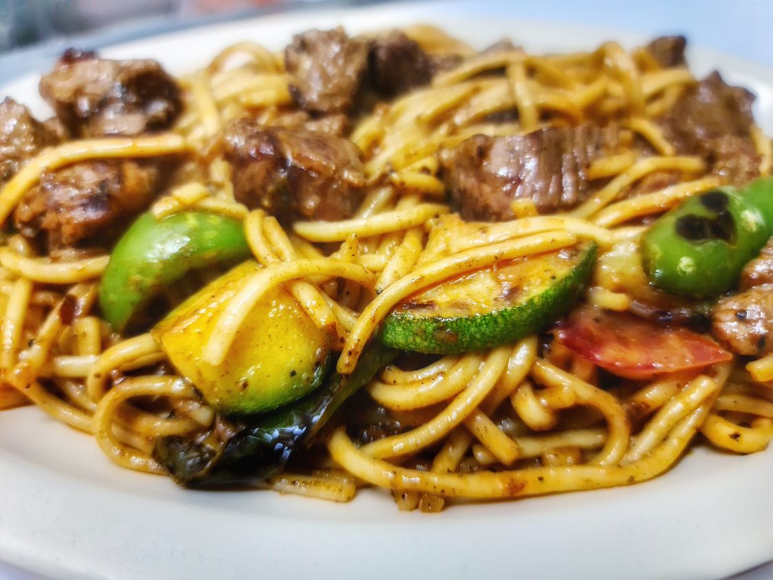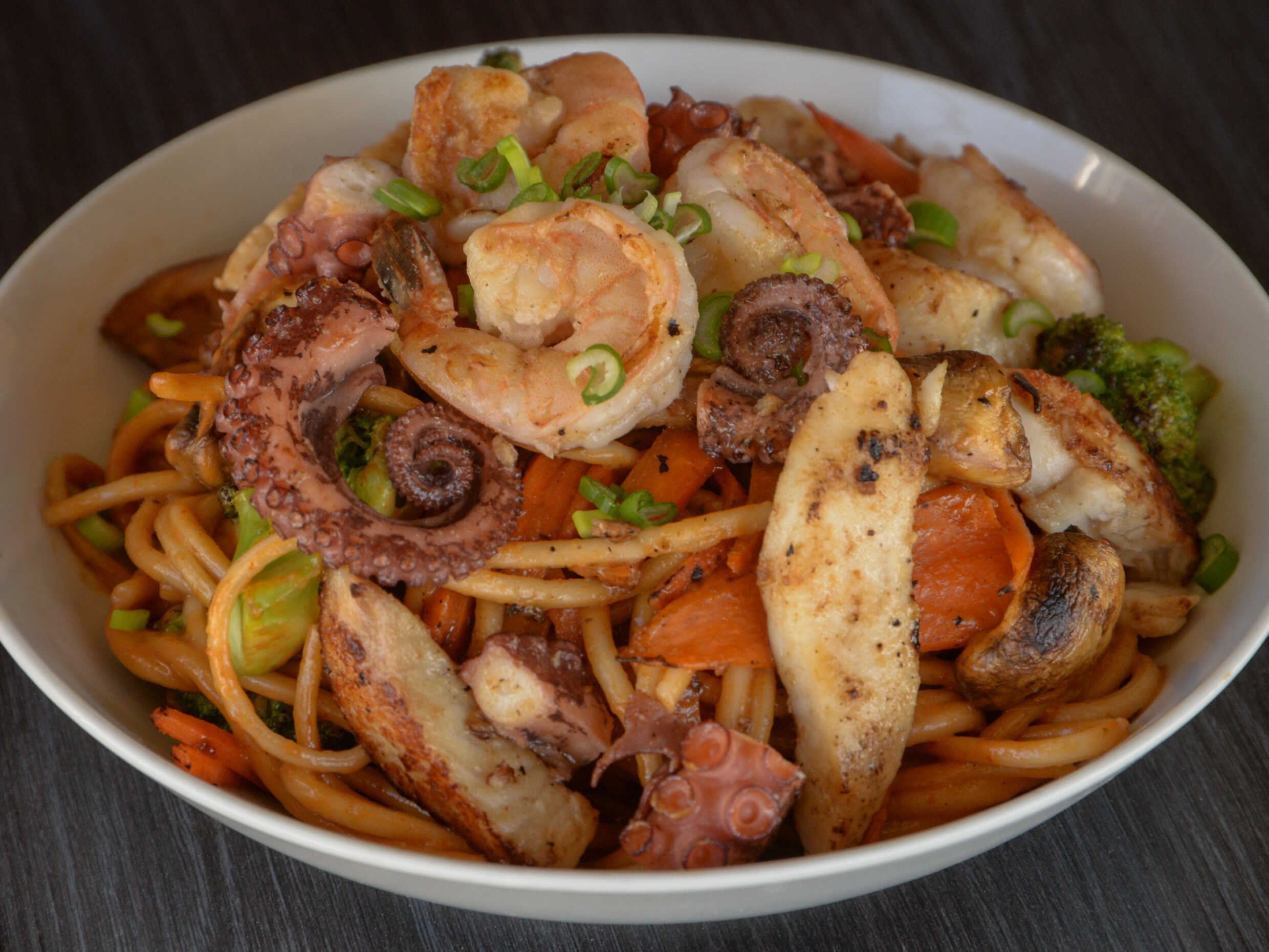 Pasta udon, brócoli, zanahoria, cebolla morada, camarón, pulpo y filete tilapia, aderezado siriracha y dulce.