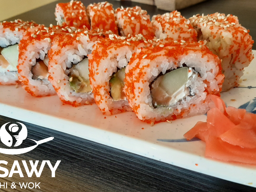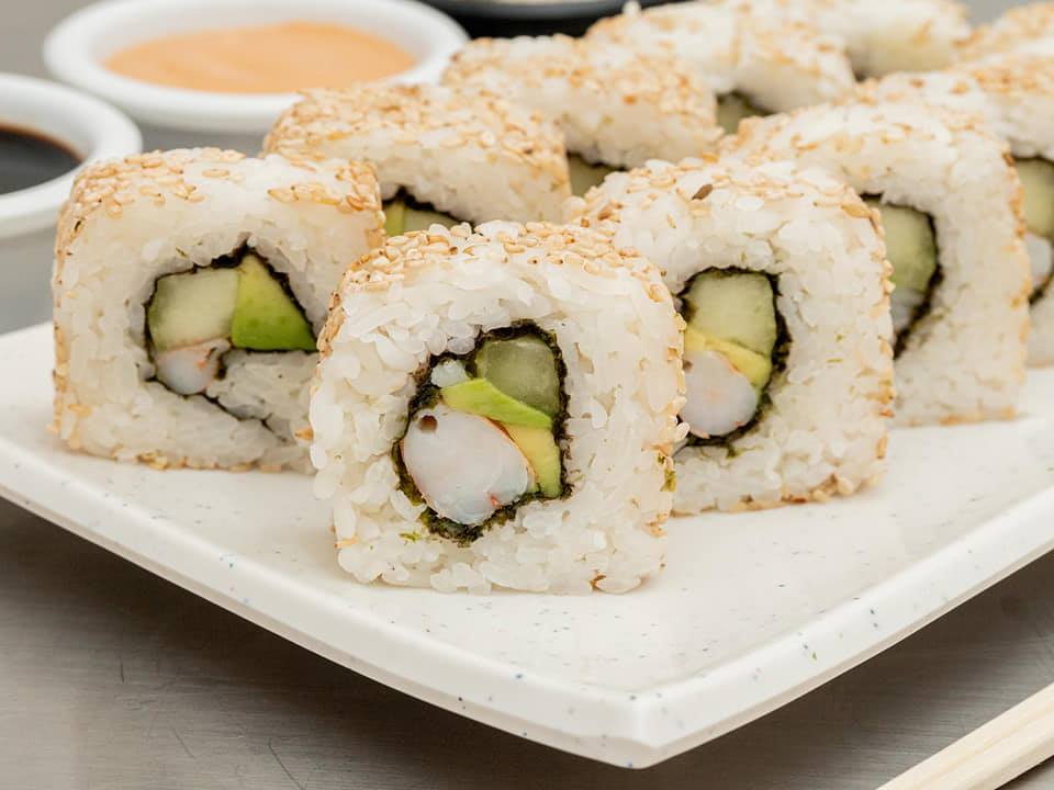 Por dentro aguacate, pepino, queso crema y camarón cocido. Por fuera masago y ajonjolí.