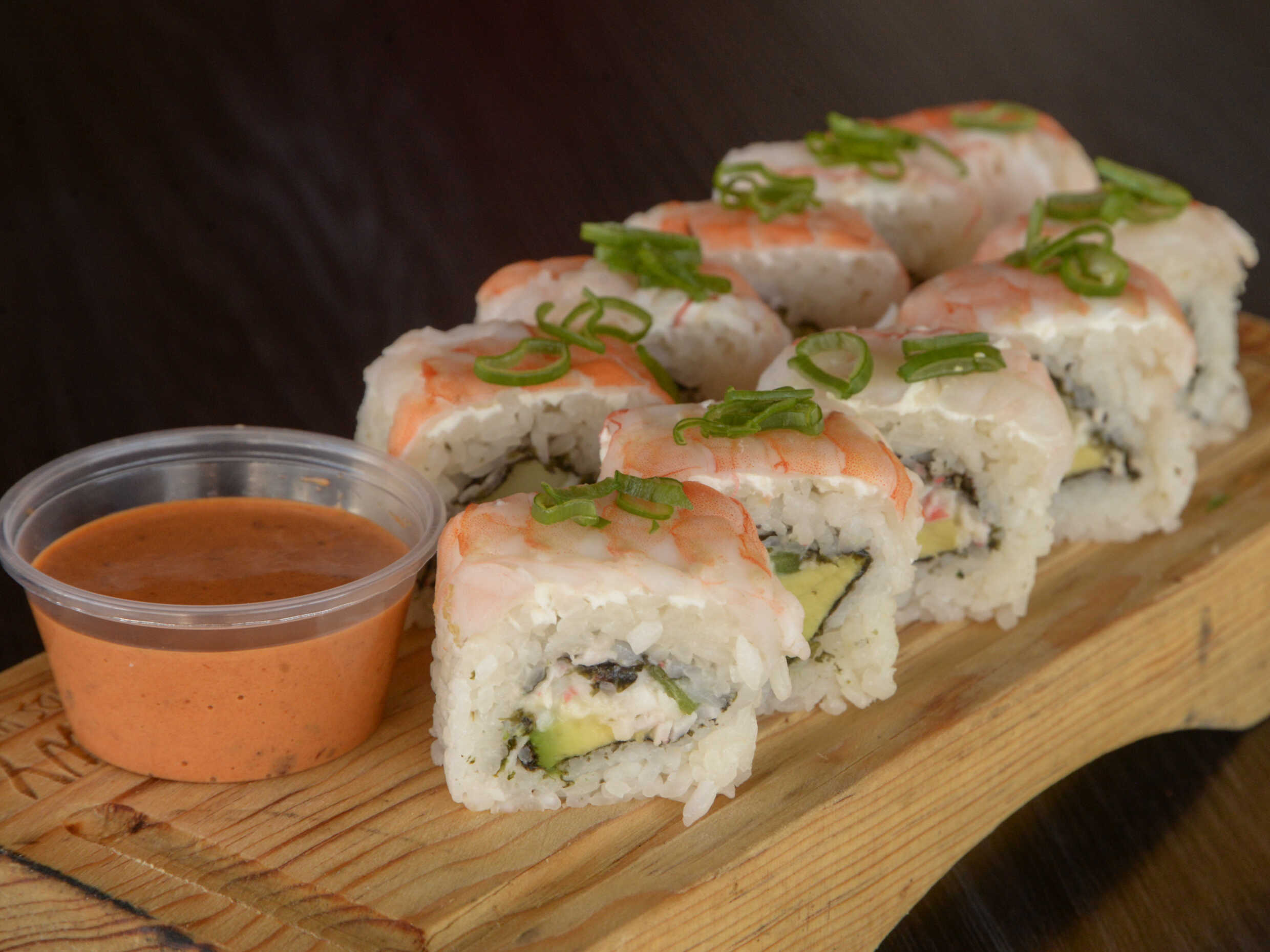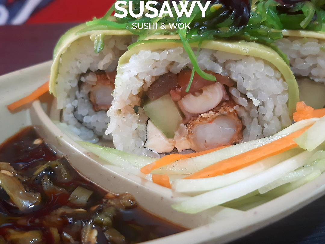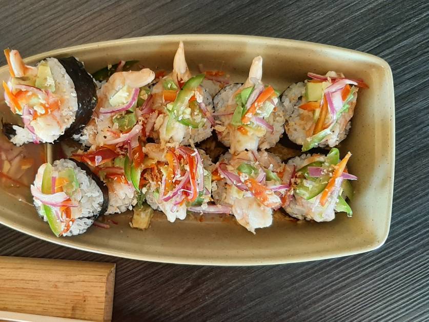 Por dentro camarón al ajillo, cebolla y zanahoria azada. Por fuera aguacate, queso doble crema, furikake y aderezo siriracha.
