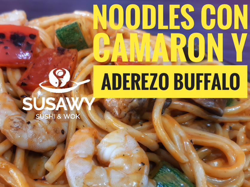 Pasta udon, camarones, calabaza, pimiento rojo y champiñones. Aderezado con aderezo buffalo.
