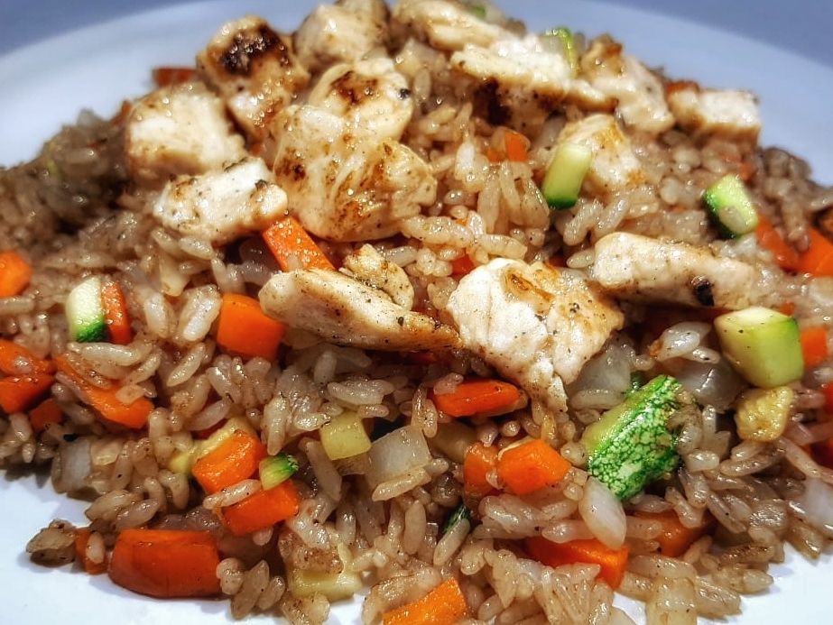 Zanahoria, calabaza, cebolla, arroz y pollo. Sazonados con soya, mantequilla y el toque de la casa.