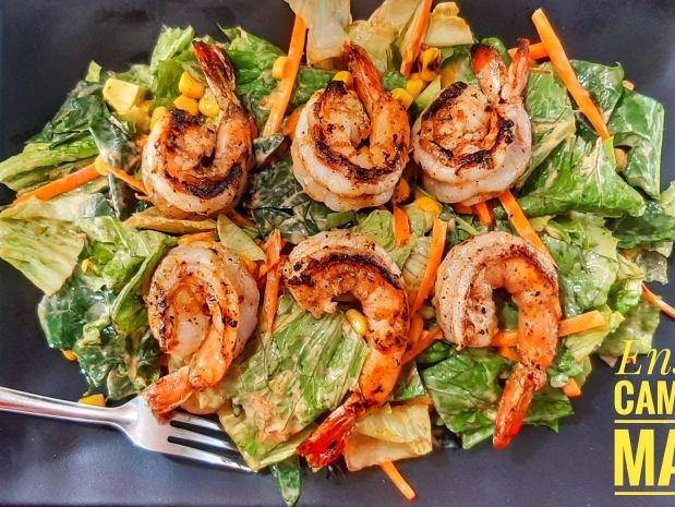 Camarones, lechuga, pepino, zanahoria, aguacate, elote, mango. Aderezada con chipotle y un toque de cilantro.