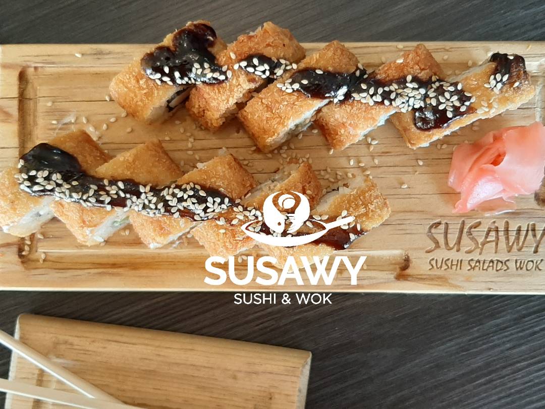 4 piezas de California Roll con Camarón, El Empanizado Roll, Philadelphia Empanizado, Kakiague Roll y Yakimeshi con Camaron, con salsas dulce, tampico, chipotle, soya citricos y soya con chiles toreados, acompañados de arroz con camarón