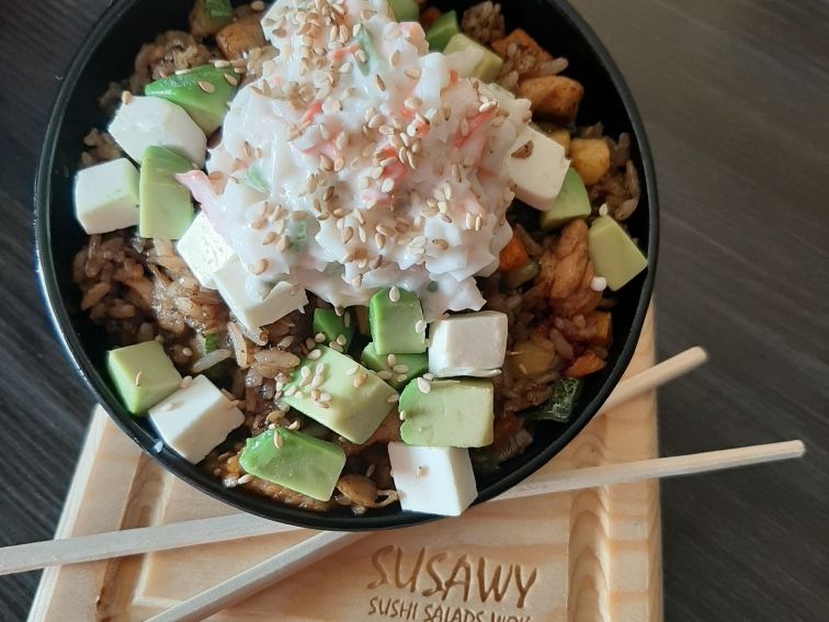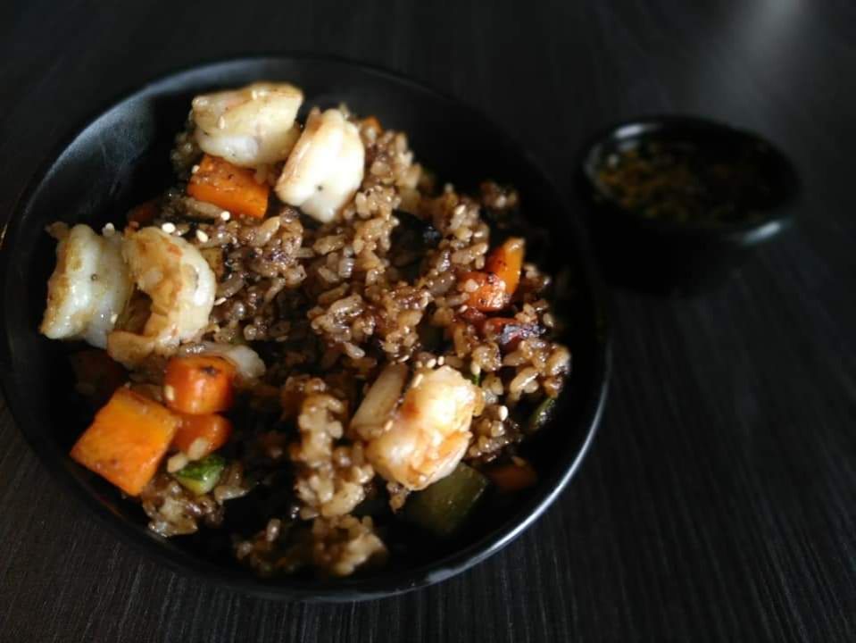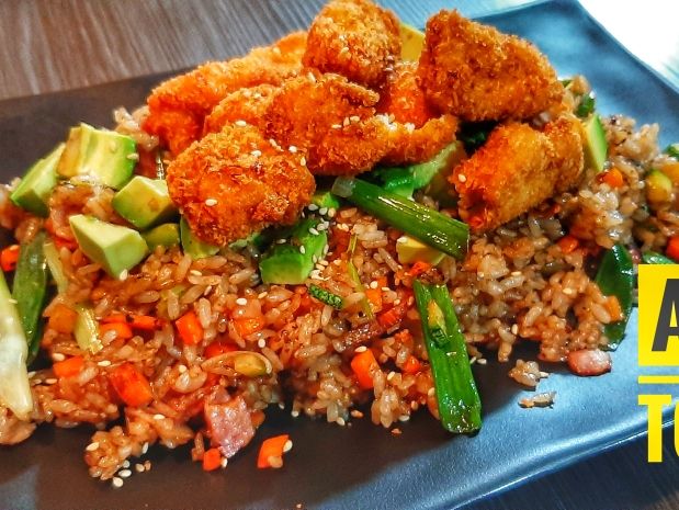 Un yakimeshi con la proteína de tu elección, queso crema, aguacate y pasta tampico y ajonjolí.