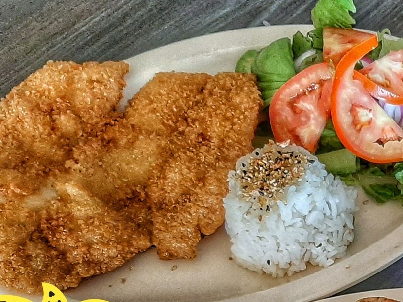 Pechuga de pollo capeada y aderezada con salsa a la naranja acompañada con arroz blanco.