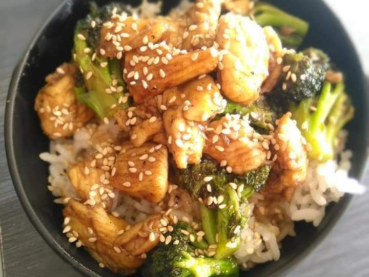 Pechuga de pollo y brócoli en salsa teriyaki, ajonjolí, acompañado con arroz blanco.