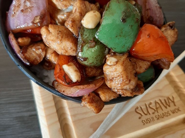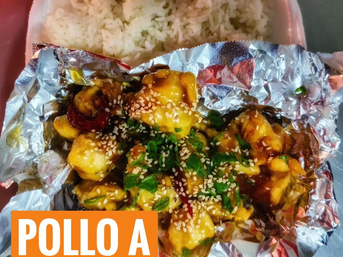 Pechuga de pollo, pimiento verde y rojo, cebolla morada, cacahuete, un toque de chile de árbol. Todo sazonado con soya. Acompañado con arroz blanco.