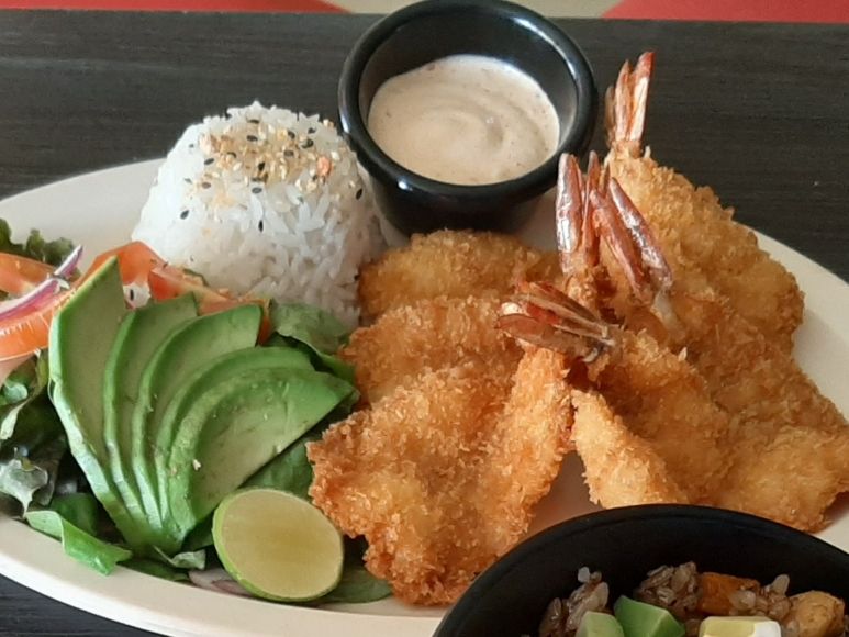 7 Pz. de camarón empanizado, acompañado de una porción de ensalada y arroz blanco.