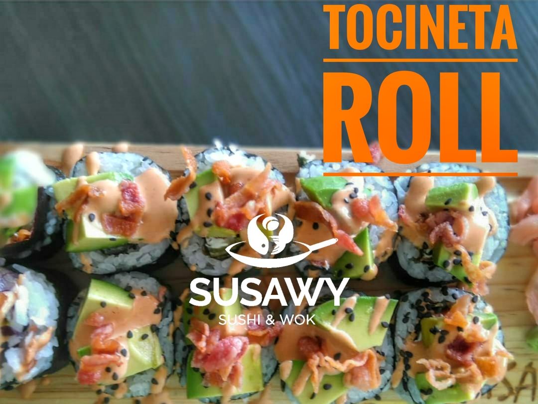 Rollo con alga por fuera. Por dentro queso crema, camarón cocido, tocino y hoja de lechuga. Por fuera aderezo de aguacate, tocino, aderezo chipotle y ajonjolí negro.