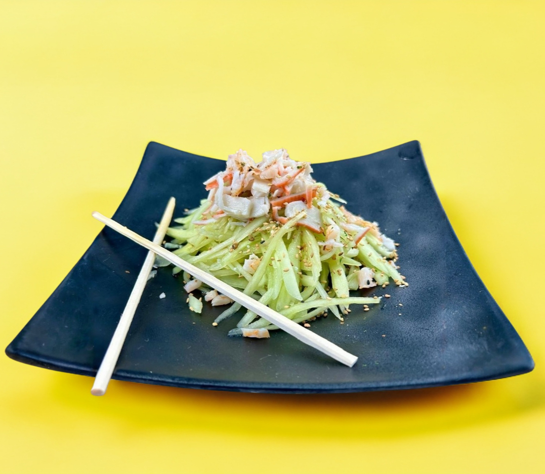 Ensalada de pepino, con ajonjolí, vinagretas y cangrejo.