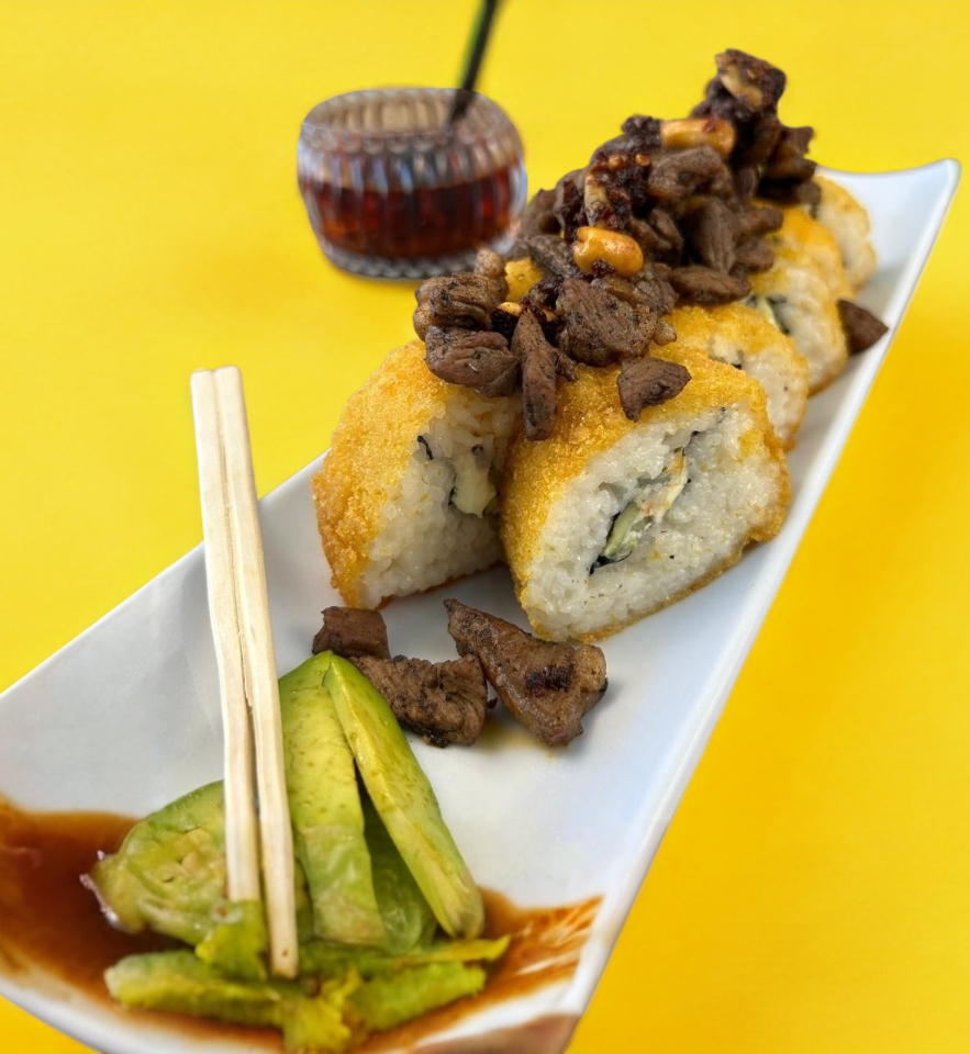 Sirloin, pepino, queso Philadelphia, por fuera bañado en salsa de chipotle y cebolla caramelizada.